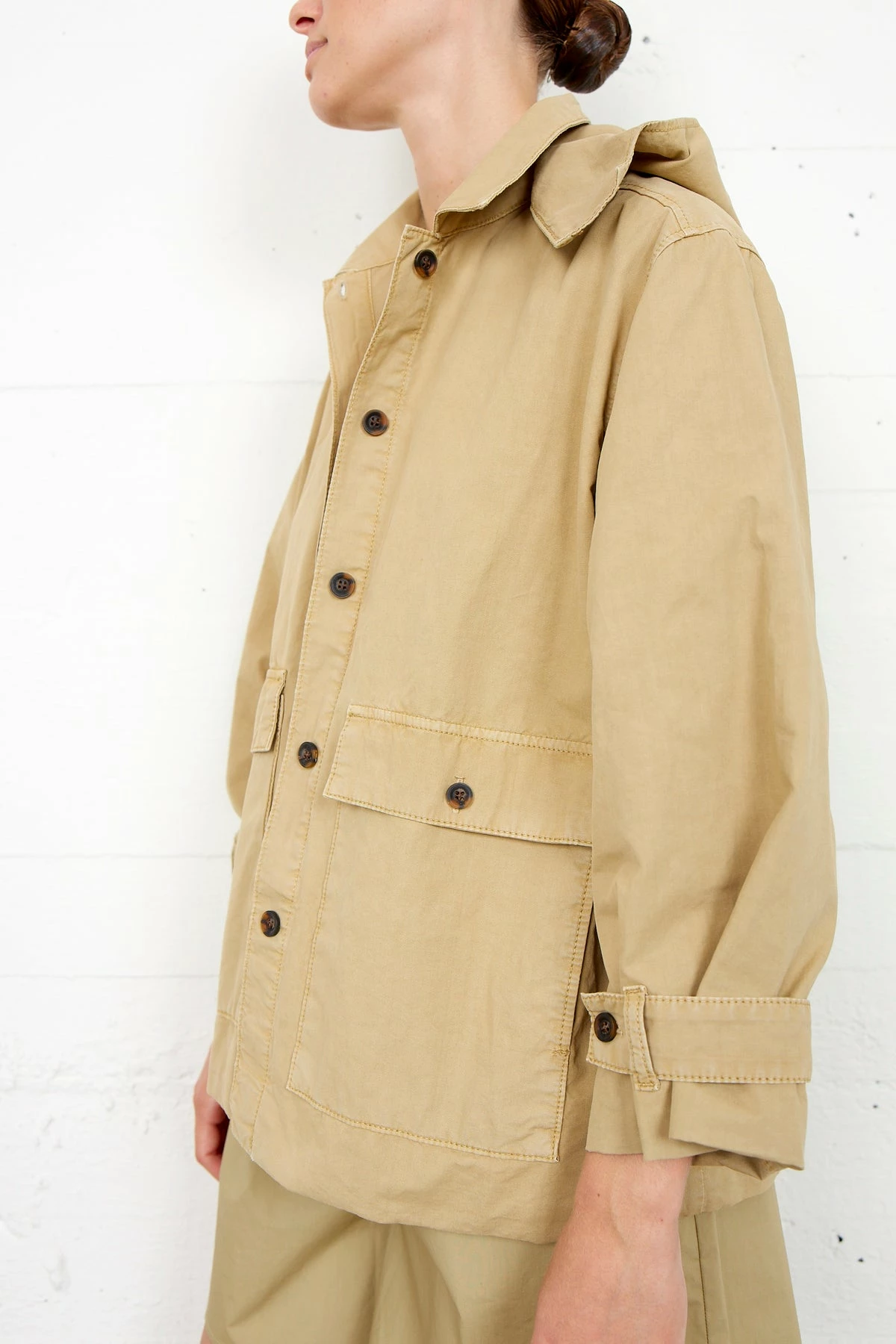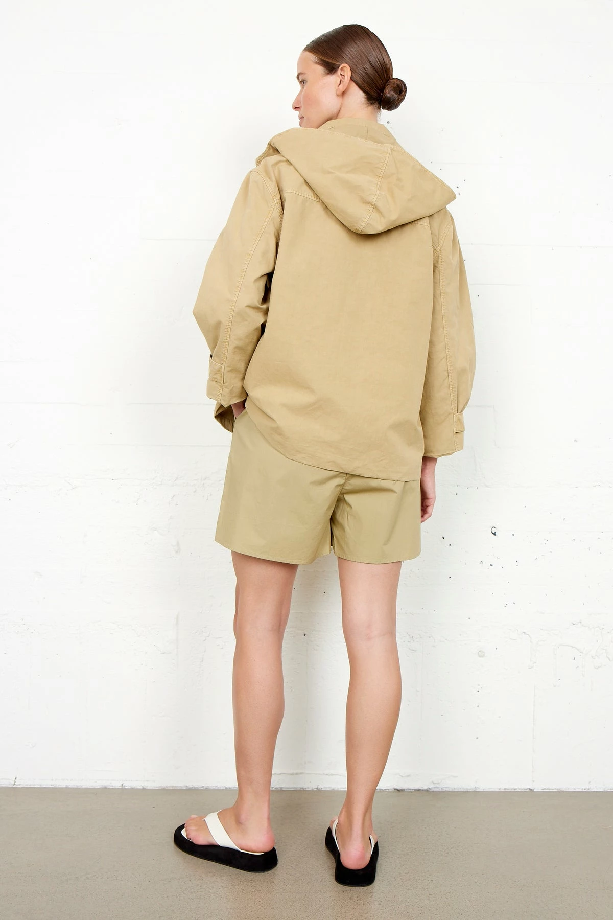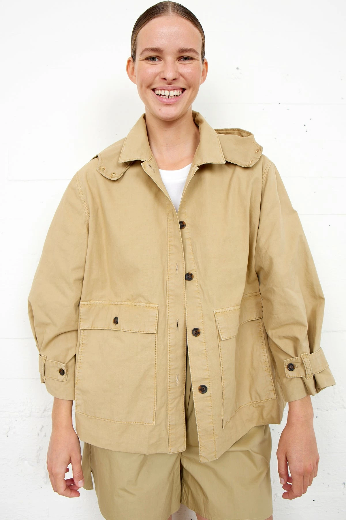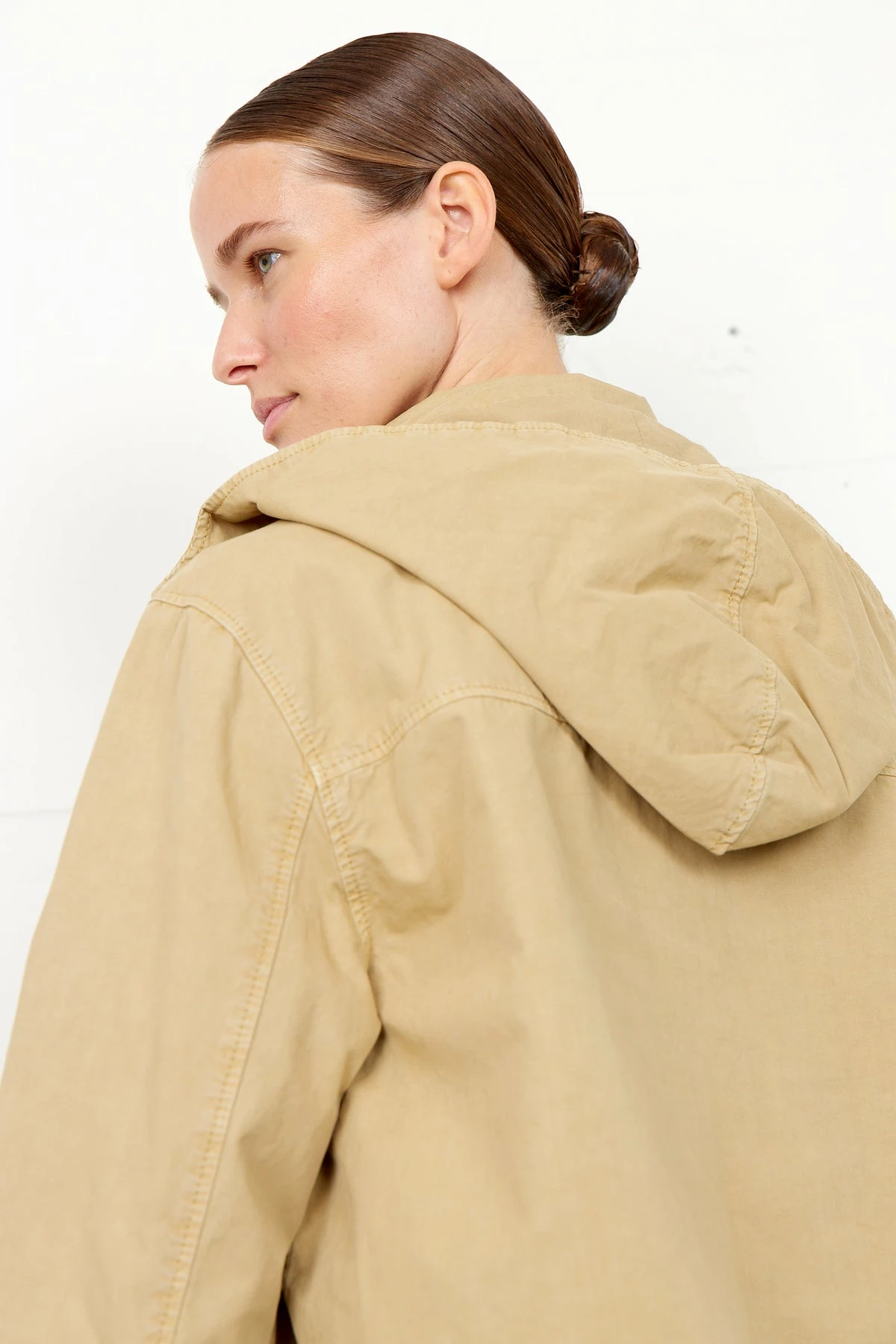 Second Female everyday jacket with hood. Made in light and crisp cotton with tonal stitching. Featuring a button-through fastening and two large flap pockets with button fastening. Loose sleeves with cuffs with straps and button fastening. Detachable hood. Loose, relaxed fit with plenty of room to move. Fully lined.