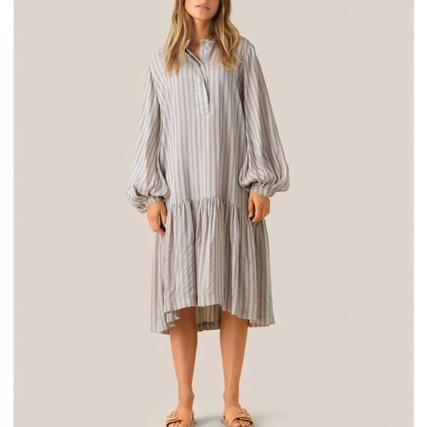 This feminine dress is made from a smooth, soft viscose and polyester blend in a lovely wide stripe. The dress has a Mandarin collar and wide section, which hides the button fastening in the neckline. The dress has long balloon sleeves that finish in a slim cuff with fine, feminine crinkles. The dress has a seam over the hips with fine crinkles for extra flow and movement. Style: Second Female Loga Striped Dress Composition: 95% viscose, 5% polyester Care: 30 degree wash