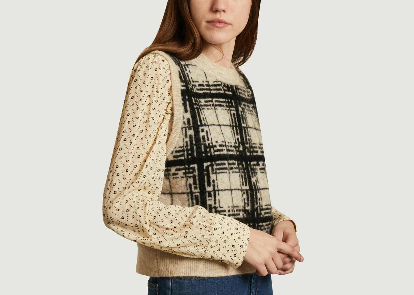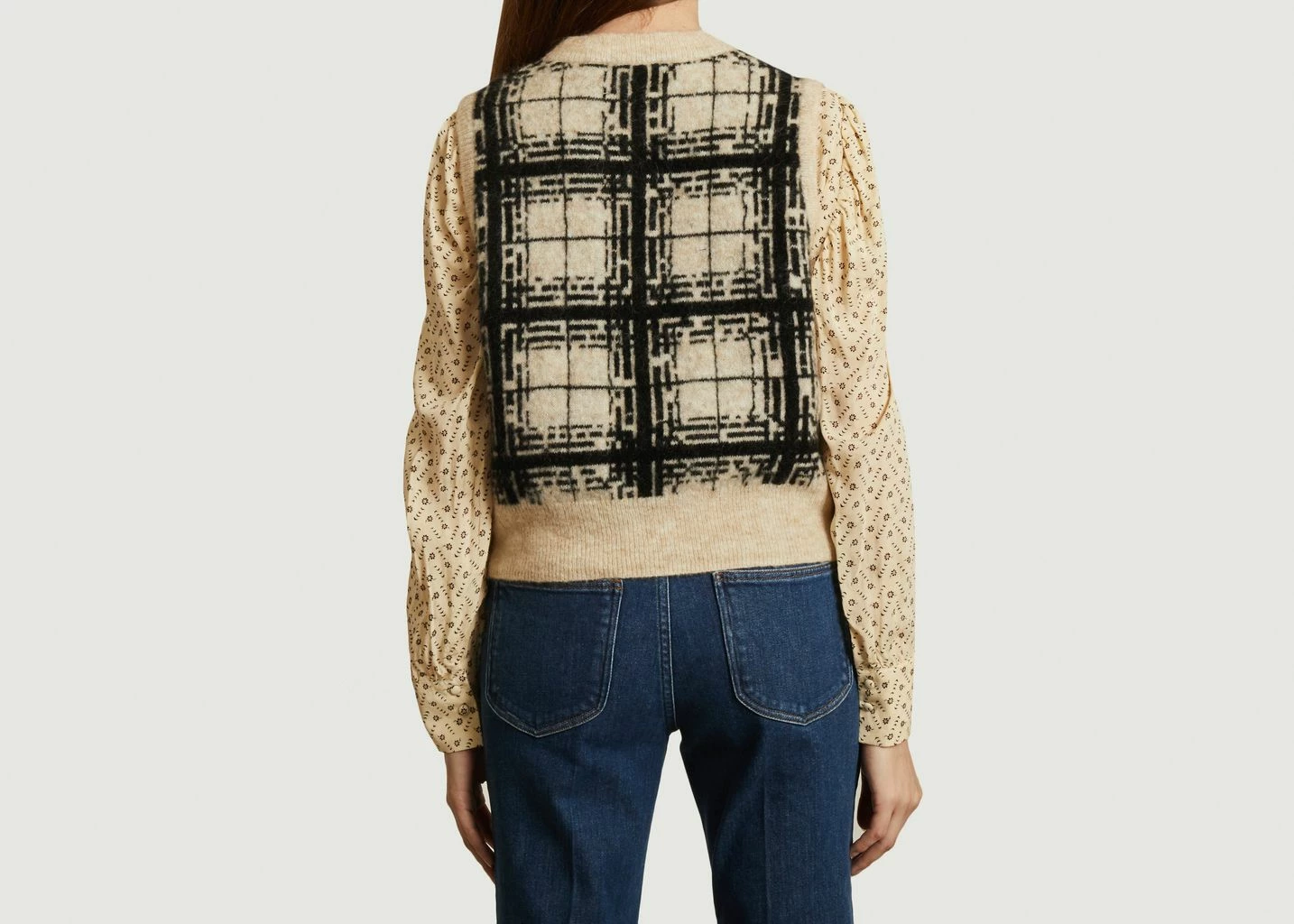 Sleeveless sweater with ecru/black check pattern in mohair, wool and polyamide, straight cut, round neck, ribbed finishes.