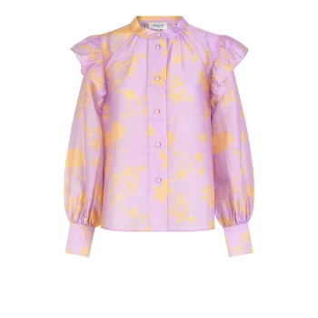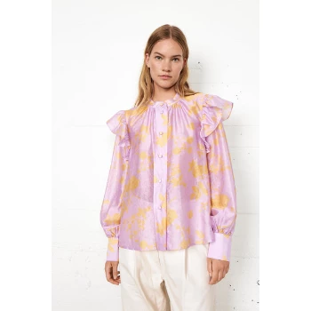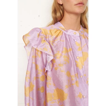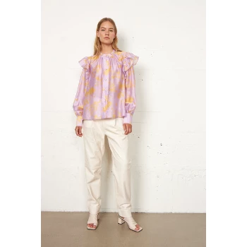 Loose fit. Mao collar. Big sleeves. Decorative ruffles.