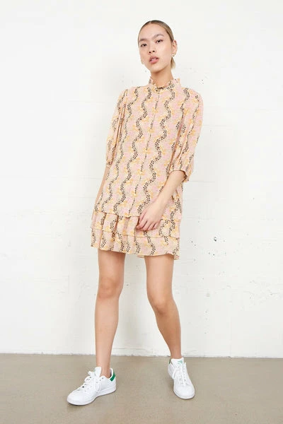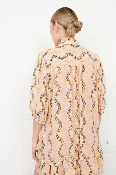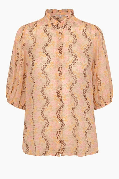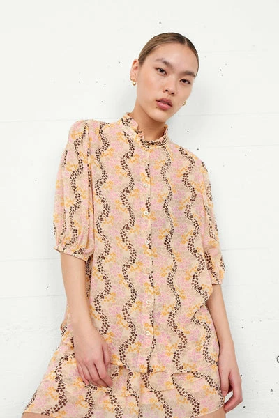 Semi-sheer viscose with print Collar with ruffle trim Loose, airy fit Hand wash Bleach – Do not bleach Tumble Dry – Do not tumble dry Ironing – Low Dryclean – Any Solvent Except Trichloroethylene Drying – Line Drying Iron into shape when damp Shrinkage up to 5%