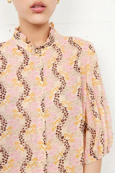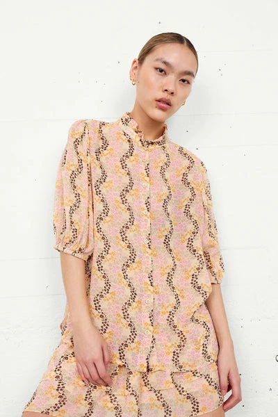 This pretty blouse from Second Female features an all over ditsy floral print in tones of pink, peach, grey and maroon on a semi sheer viscose. The round neck has a small frill trim and it buttons through with pretty pink button while the short sleeves finish with an elasticated cuff. The perfect feminine style to wear with cream trousers for a smart look or to dress up pale wash distressed denim with a heel for a night out with the girls. Round neck with small ruffle collar Button through Straight hem Short puff sleeves Elasticated cuff 100% Viscose Hand wash Length 65cm centre back (S) 55cm chest (S) 56002