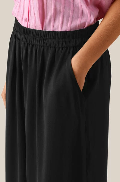 Second Female trousers made in a luxurious, 100% recycled polyester quality. The trousers have loose fit, elasticated waist, side pockets and wide hemline. This is a must have wardrobe piece. Sustainable choice Soft and silky fabric Wide-legged silhouette