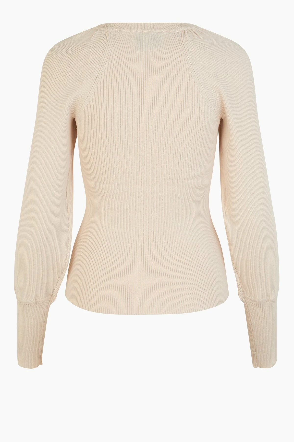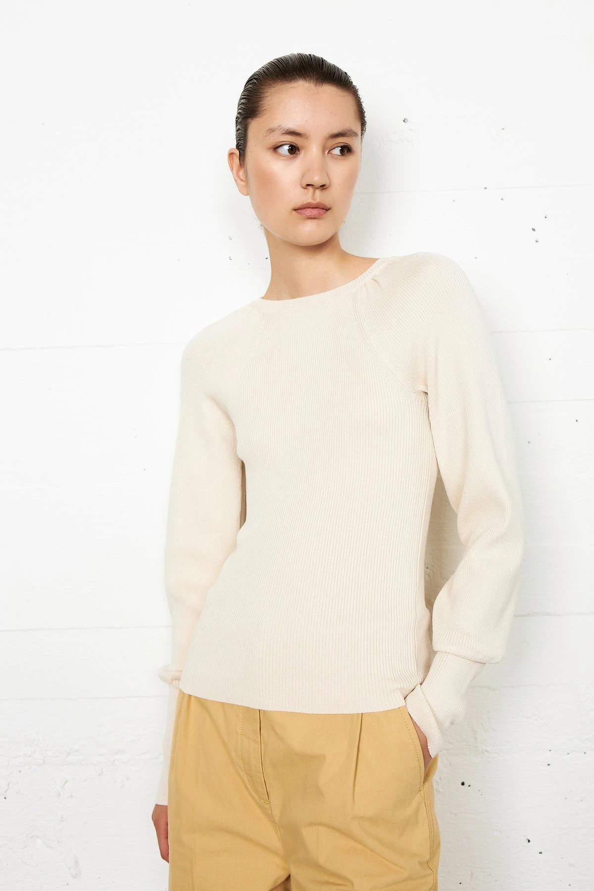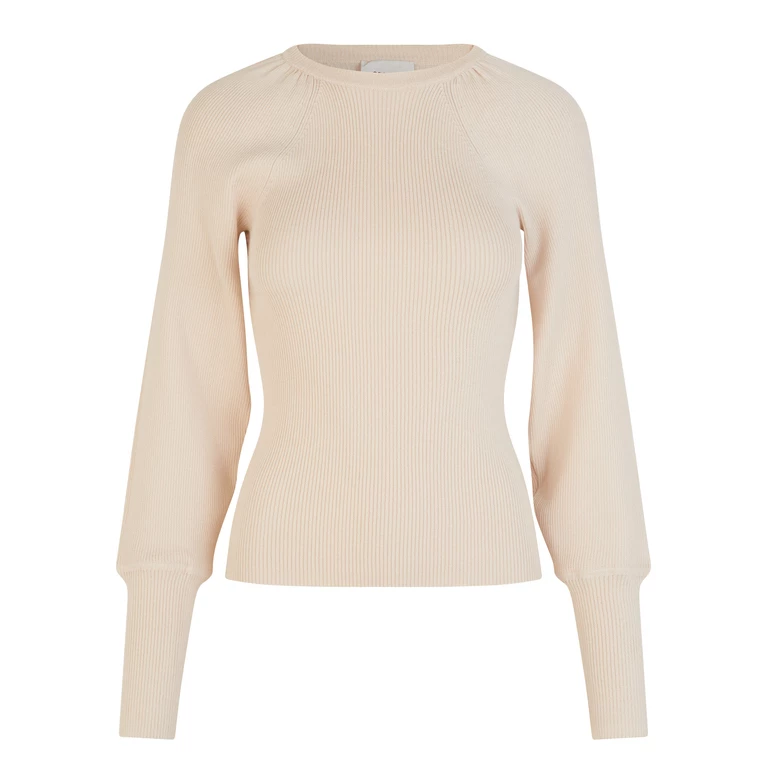 Knitted blouse with slim fit and o-neck. The Nerine Knit has gatherings and fine ribbing along the rounded neckline and high cuffs. The knit has voluminous, raglan sleeves.