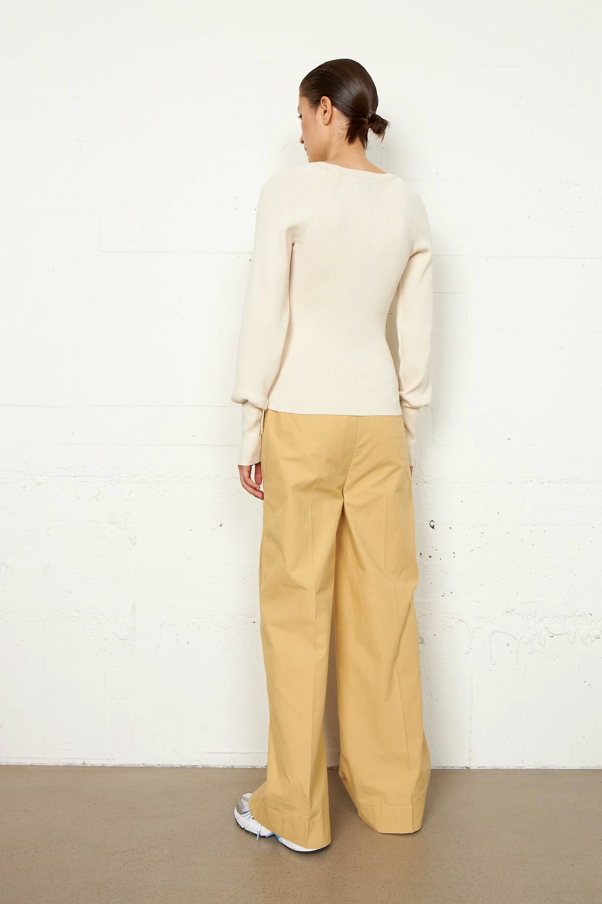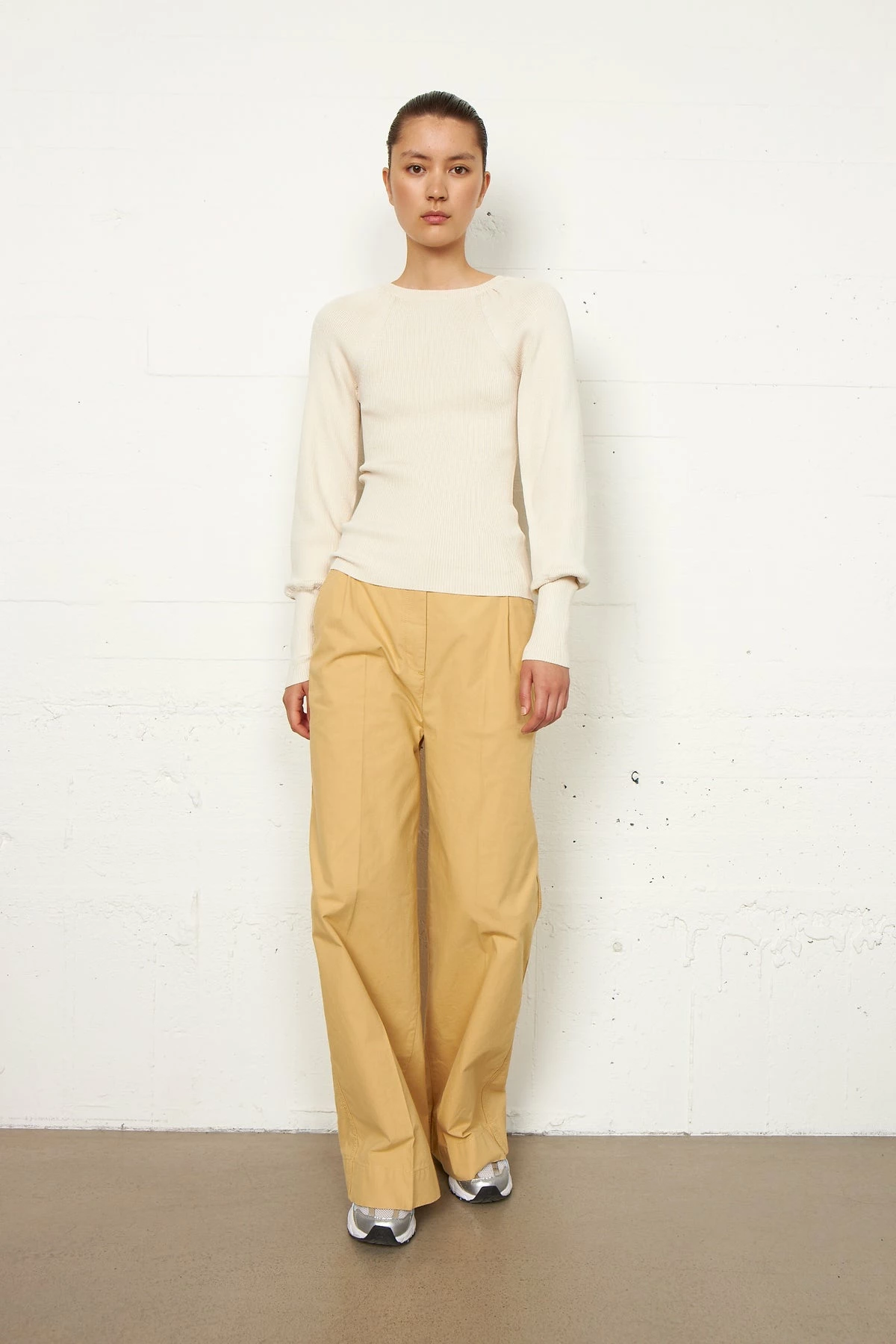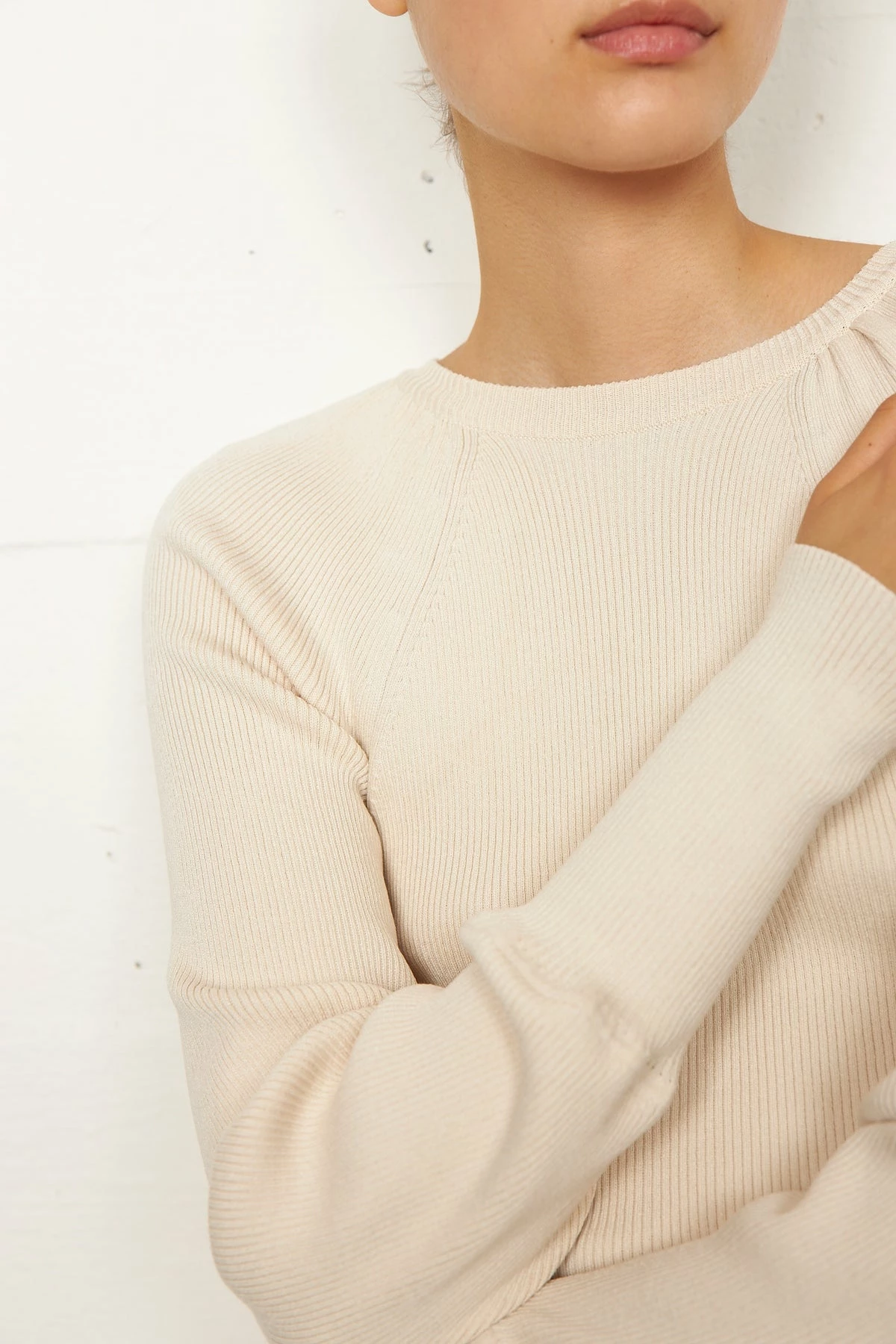 Knitted blouse with slim fit and o-neck. The Nerine Knit has gatherings and fine ribbing along the rounded neckline and high cuffs. The knit has voluminous, raglan sleeves.