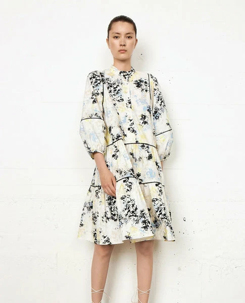 Second Female Nyssi Pear Dress, a loose fitting dress with midi length. In white, yellow and black with visible piping, the sleeves are loose with gatherings at both sleeve openings and shoulders. The neck has a mao collar and placket with visible buttons. Loose fitted dress Midi length Big sleeves Decorative black pipings 100% Cotton Machine wash at 30 XS – UK8, S – UK10, M – UK12, L – UK14 Size down if between sizes as Second Female sizes generously