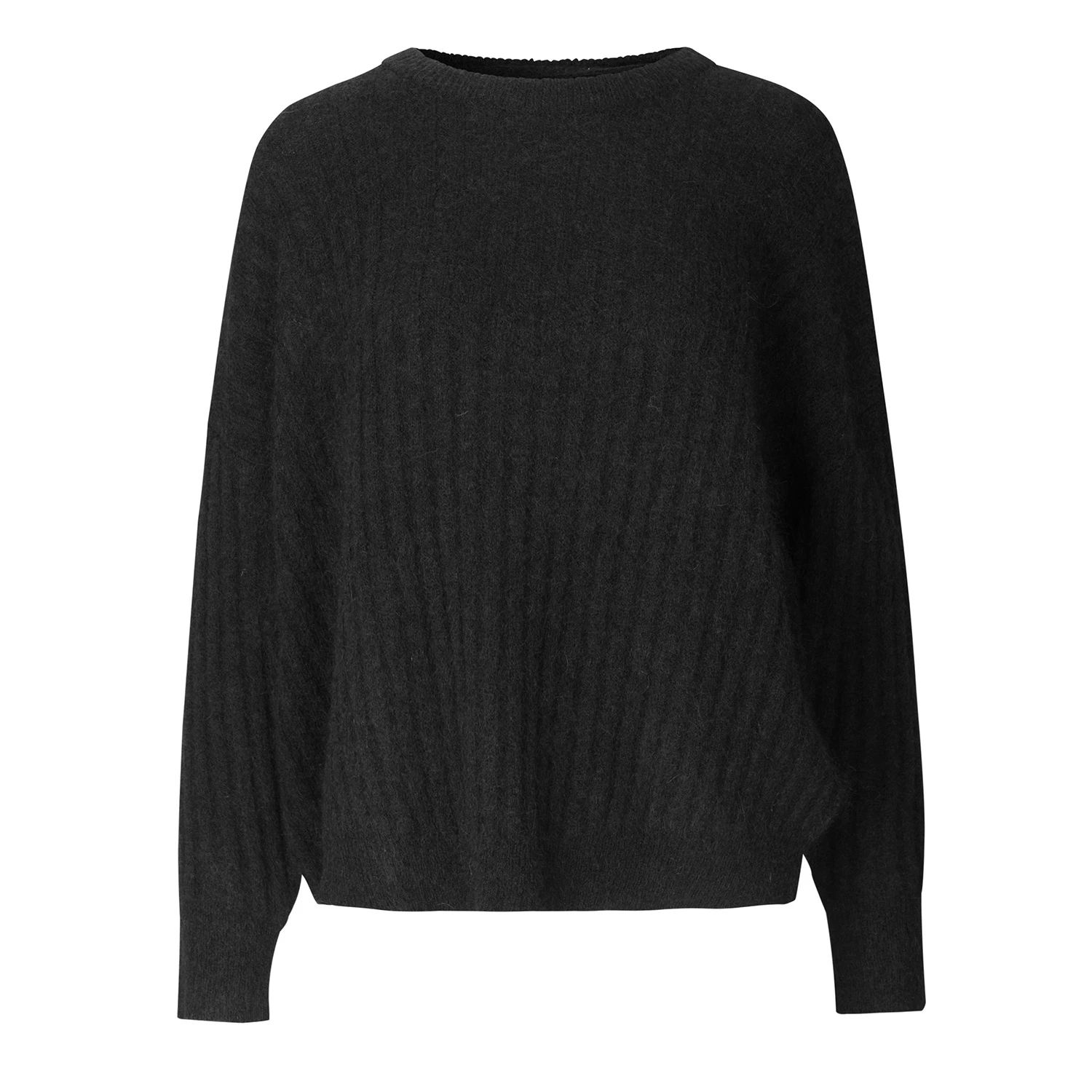 Colour: Black • O-neck sweater • Open back detail • Vertical chunky ribs Composition: 34% Mohair, 34% Wool, 27% Polyamide, 5% Elasthane Care label: • Cold hand wash • Do not wring – Do not tumble dry • Do not bleach • Ironing – Low • Lay flat for drying and storing to ensure shape