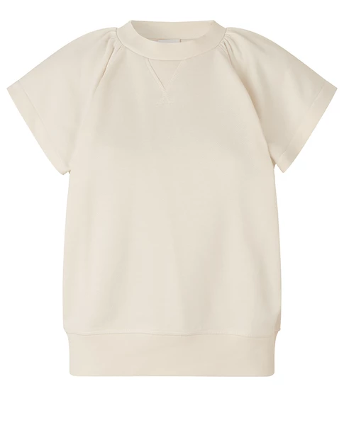 Second Female Polifoil Whisper Sweatshirt, an off white jersey sweatshirt with short flared sleeves and a high round neck. Finished with ribbing on the neck and hem the Polifoil sweater also comes in Nantucket Blue. 85% Cotton & 15% Polyester Machine wash at 30 XS – UK8, S – UK10, M – UK12, L – UK14 Size down if between sizes as Second Female sizes generously