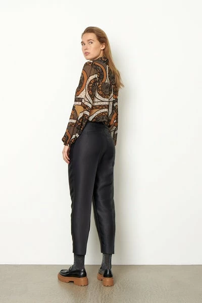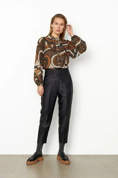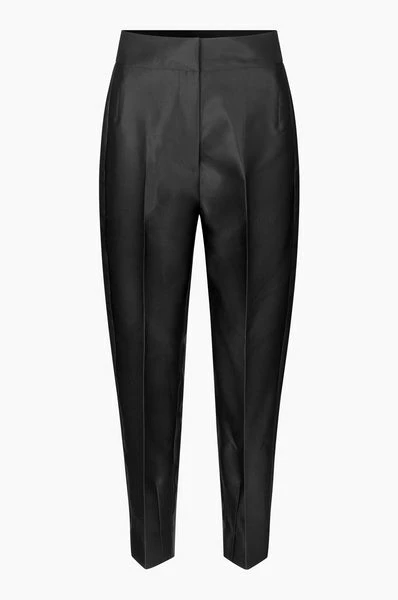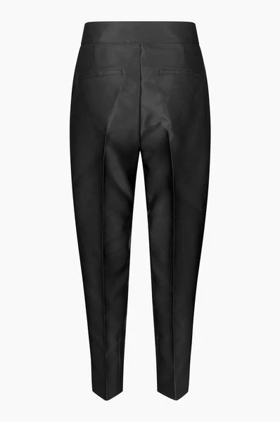 Second Female elegant trousers made in a shiny, 100% recycled polyester quality. The trousers have wide waistband with hook & eye and zipper closure. It has paspoil pockets at back and crease line details. The trousers have high-rise and slim leg fit