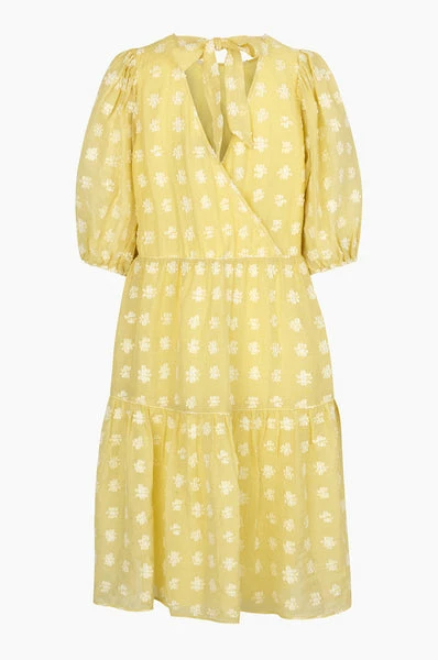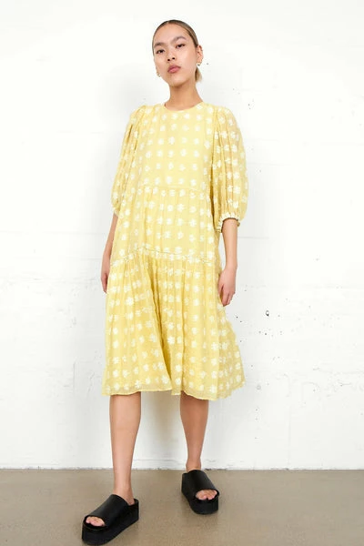 Second Female voluminous tiered dress. Made in a light, semi-sheer cotton-blend with 3D flower pattern. Featuring an open back with crossover detail and tie fastening at back of neck. Puffed shoulders with elasticated ends. Loose fit with two tiers that create a feminine and voluminous effect. Lined body with unlined sleeves. Semi-sheer cotton blend Crossover detail at back Feminine tiered skirt