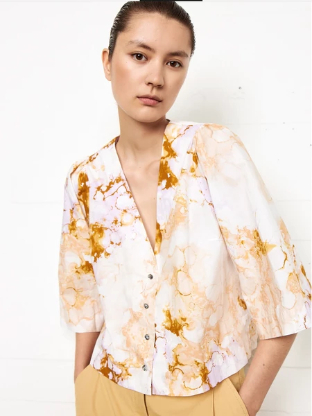 Second Female shirt with short, boxy fit. The shirt has a V-neck with button closure on front, and short, voluminous sleeves with gatherings at the shoulders. The shirt is 100% organic cotton. Shirt with short, boxy fit V-neck with button closure Short, big sleeves Part of our Sustainable Choice Twijfel je over de maat of model dan mag je altijd een berichtje sturen. Dat kan via de website chat of via instagram dm. We helpen je graag. Zo kunnen we er samen voor zorgen dat de kans kleiner is dat je het item moet retourneren of ruilen. Happy Shopping! Maaike More info or can’t find what your are looking for? Contact us