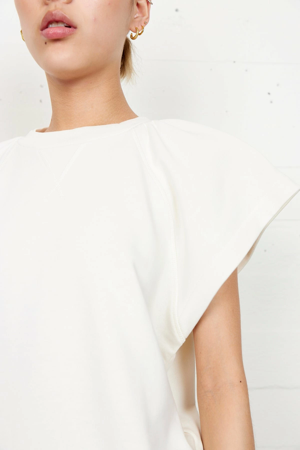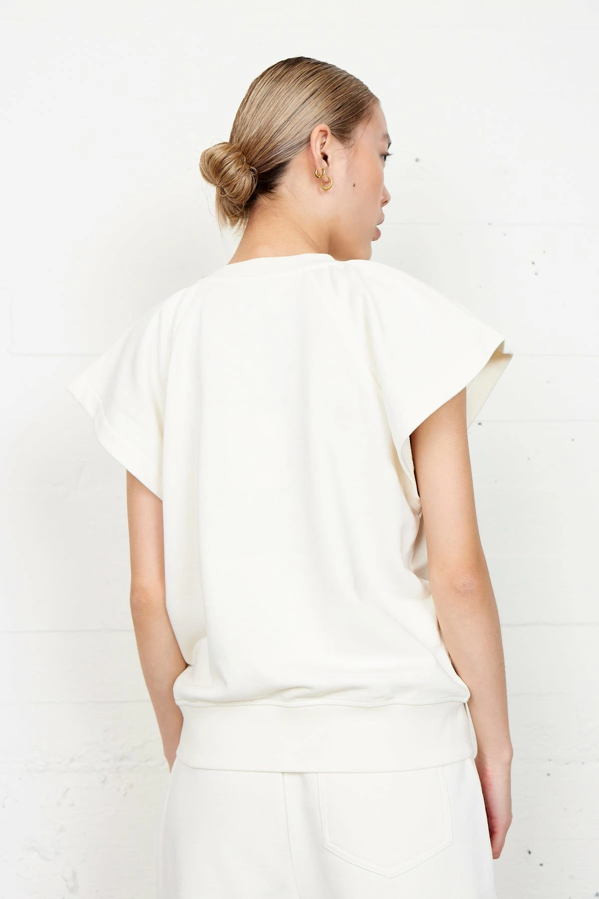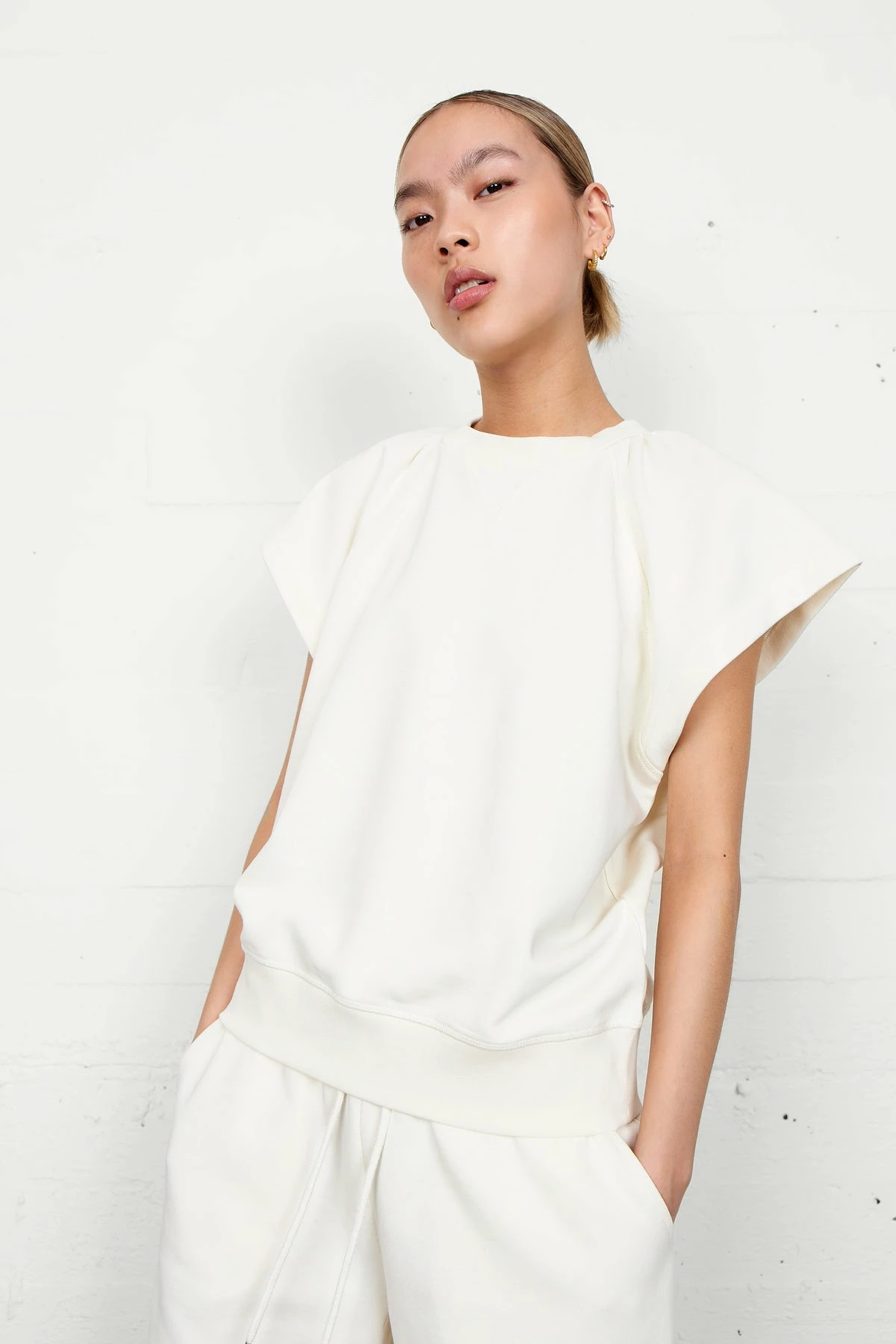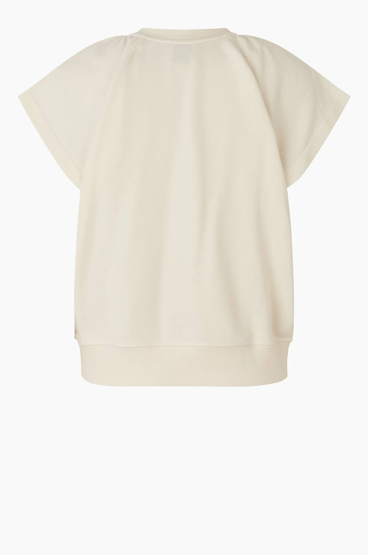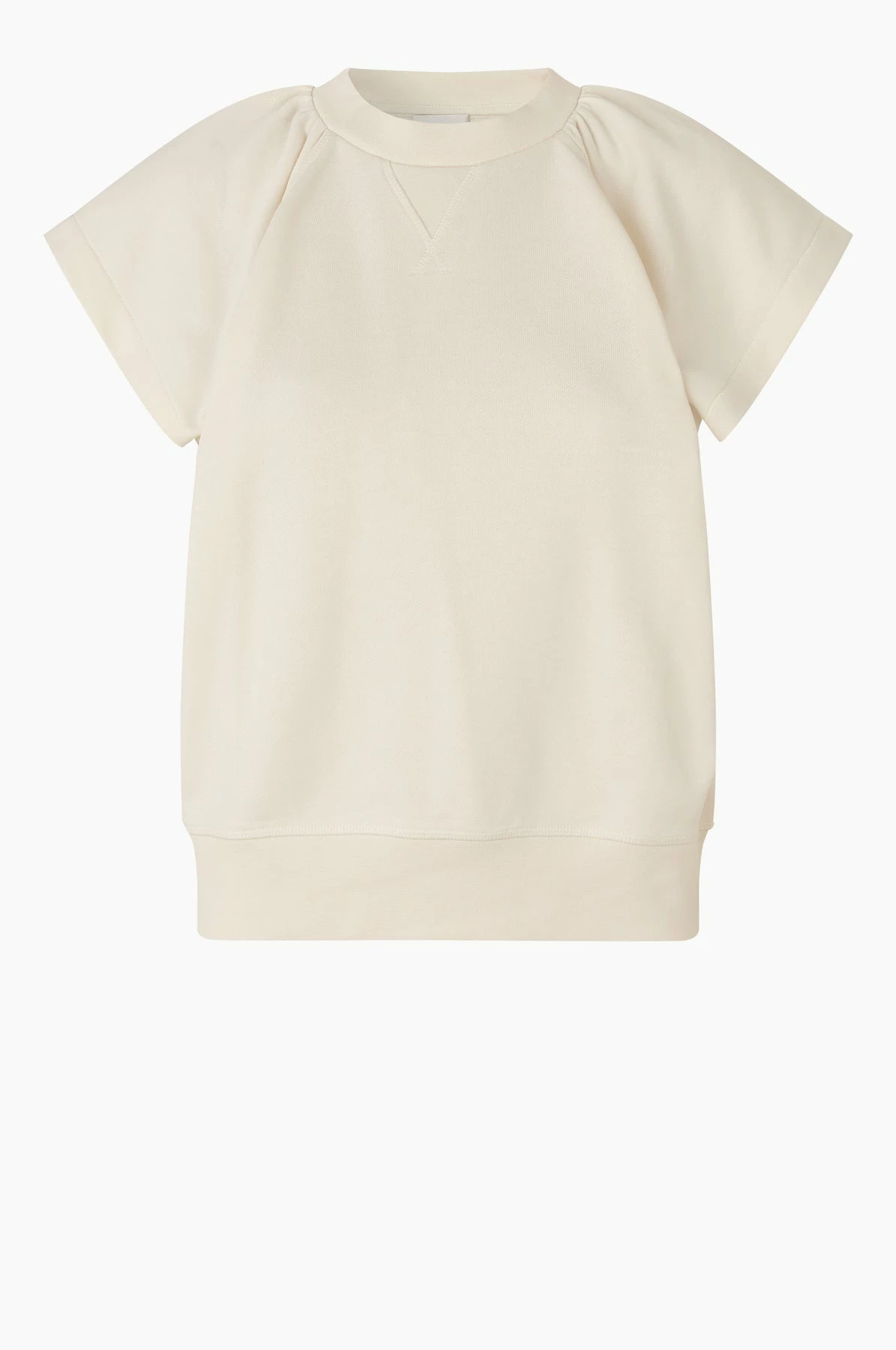 Second Female contemporary short-sleeved sweat. Made in a soft, lightweight cotton-blend. Featuring a round neck with triangle detail and raglan sleeves. Flatlock stitching details and ribbed trim at neck and bottom hem. Relaxed fit with large armholes to reinforce the casual look.