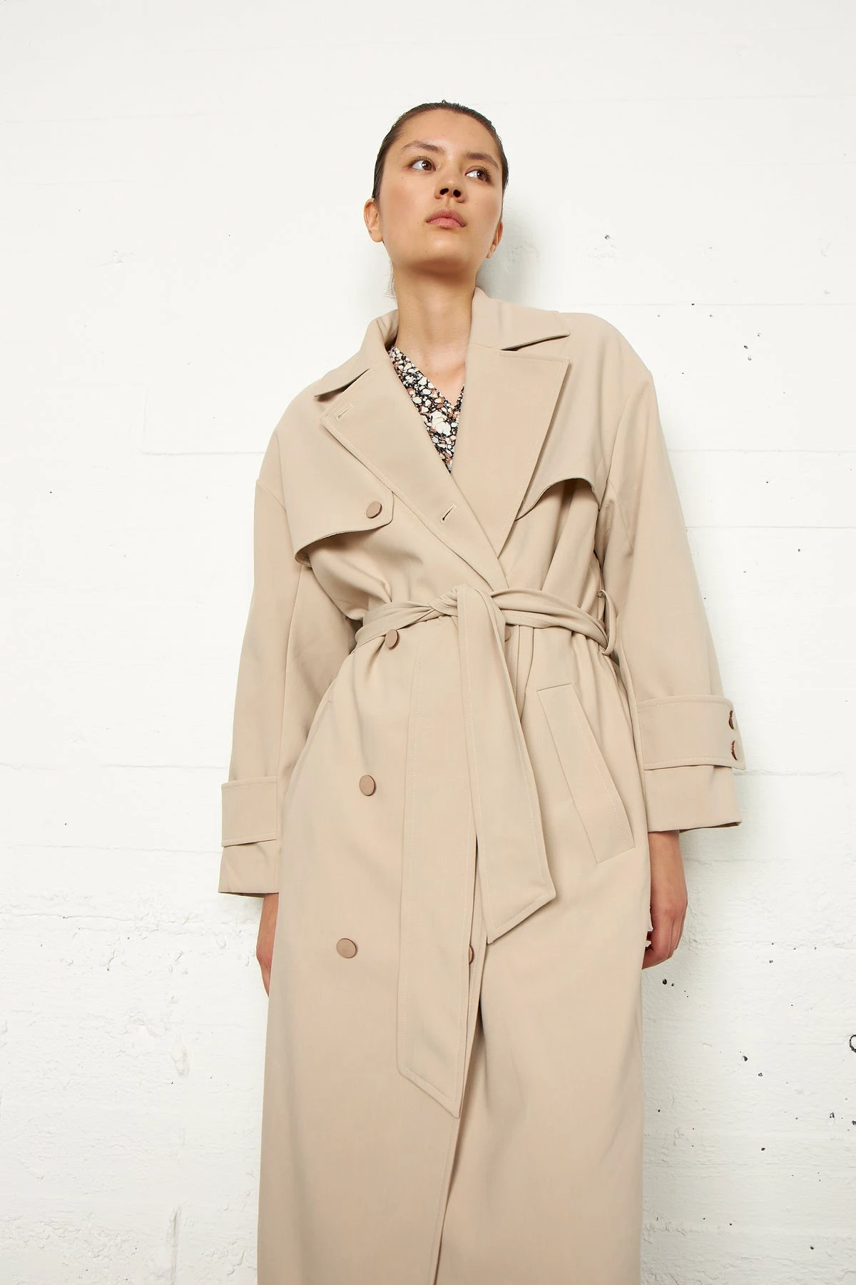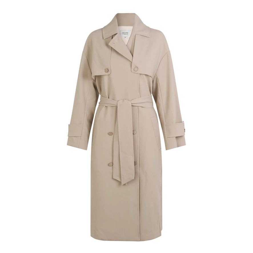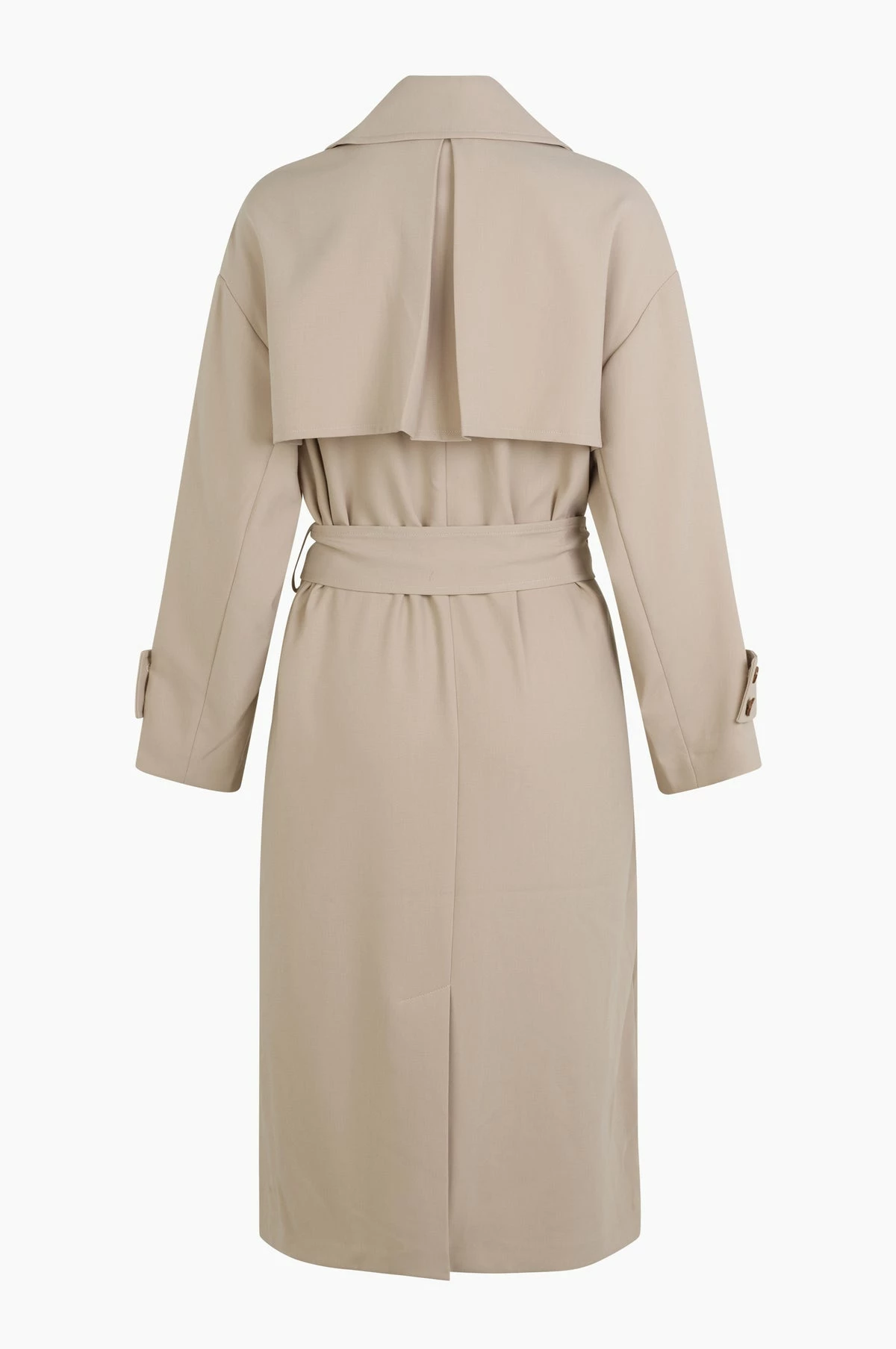 Silvia Classic Trenchcoat in classic fit. The coat has a belted waist and double breasted closure on front. On the sleeves there are decorative straps by the wrist, pockets on front and a slit on the backside.