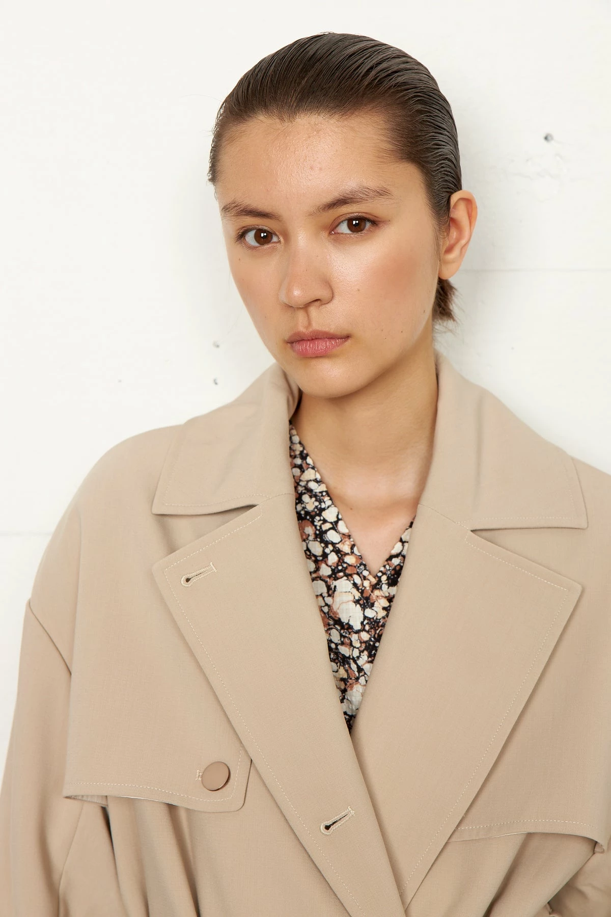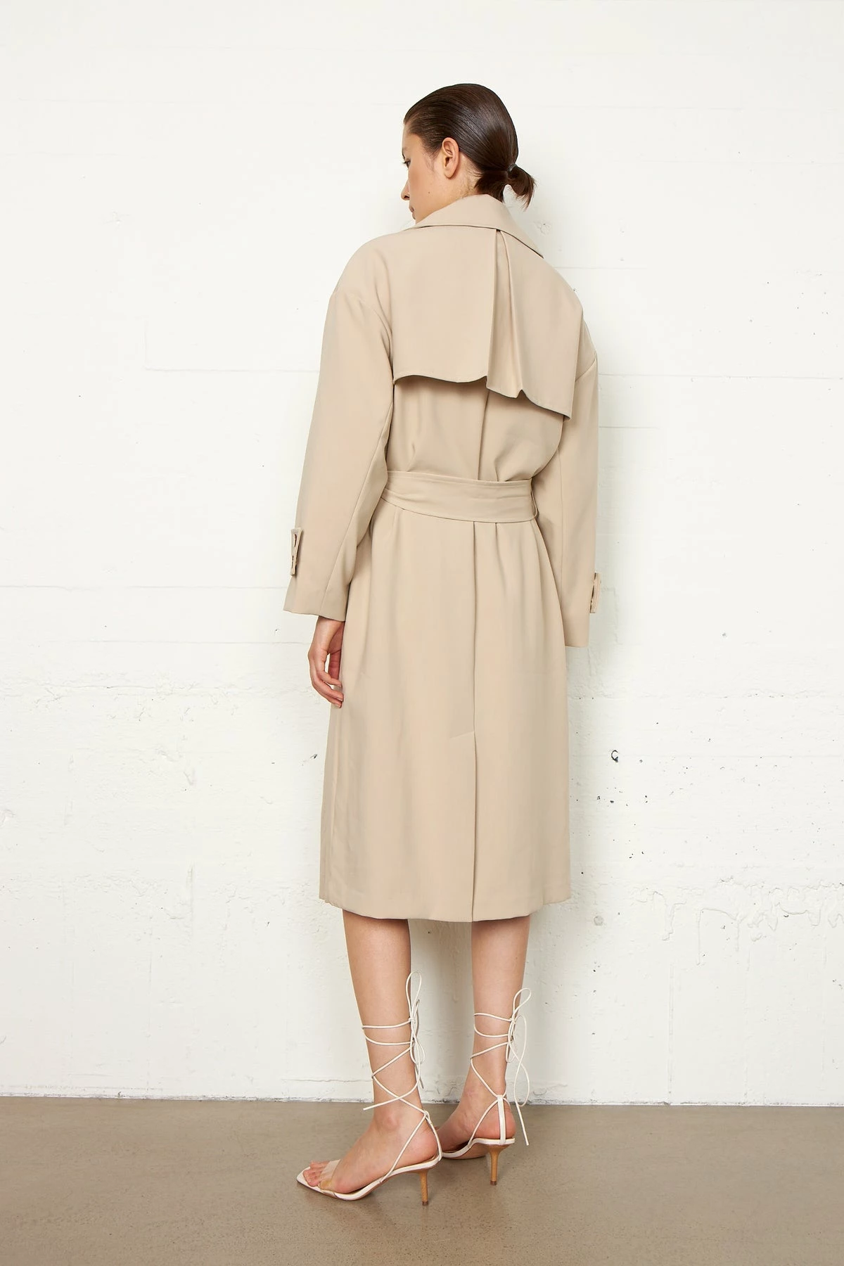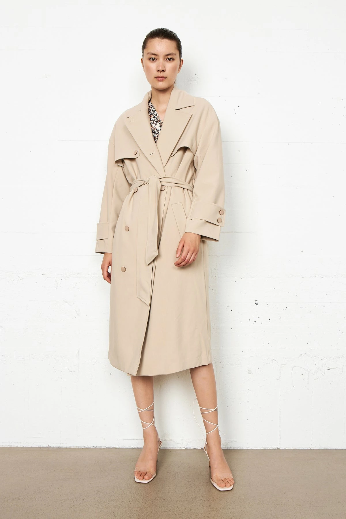 Silvia Classic Trenchcoat in classic fit. The coat has a belted waist and double breasted closure on front. On the sleeves there are decorative straps by the wrist, pockets on front and a slit on the backside.