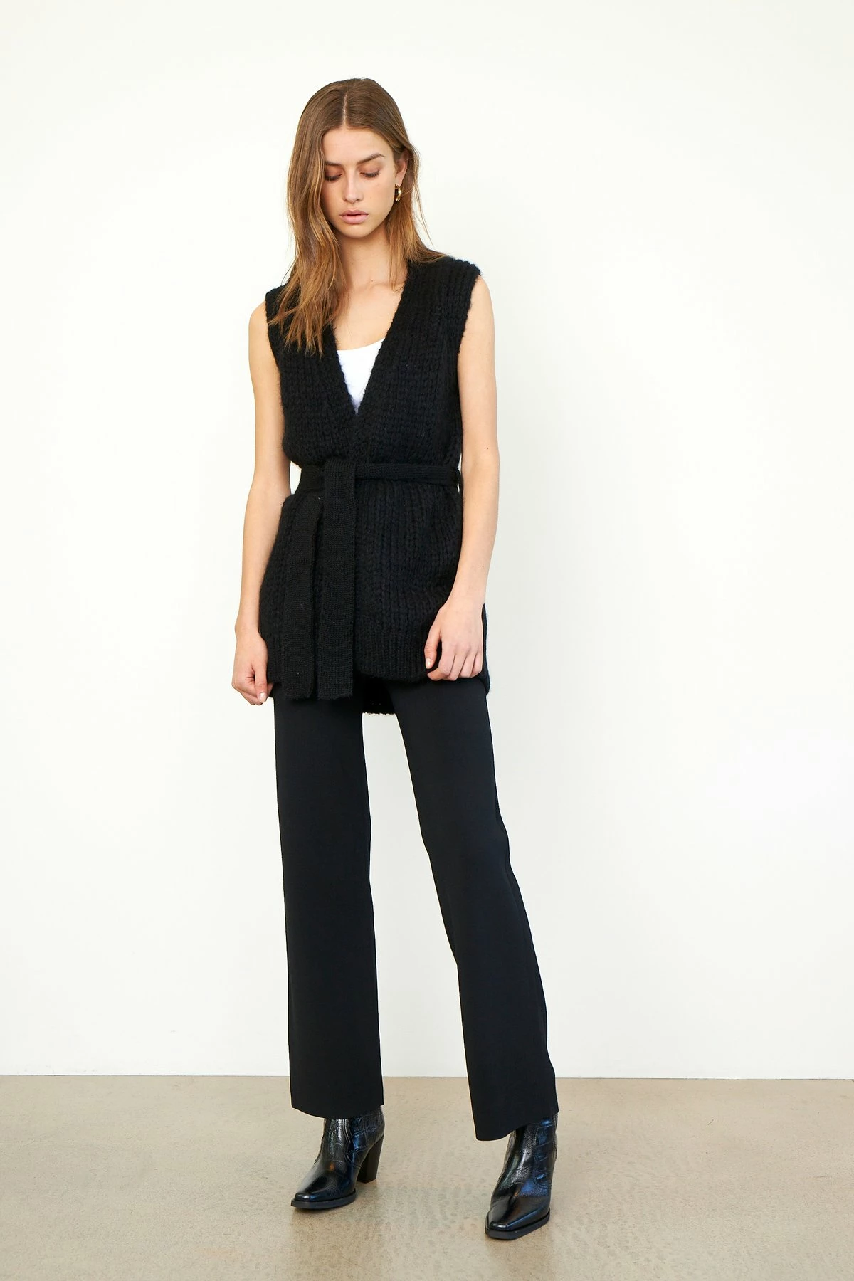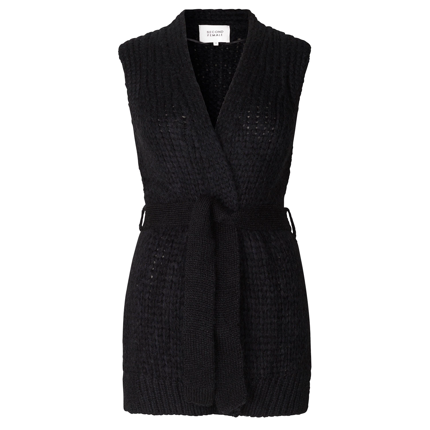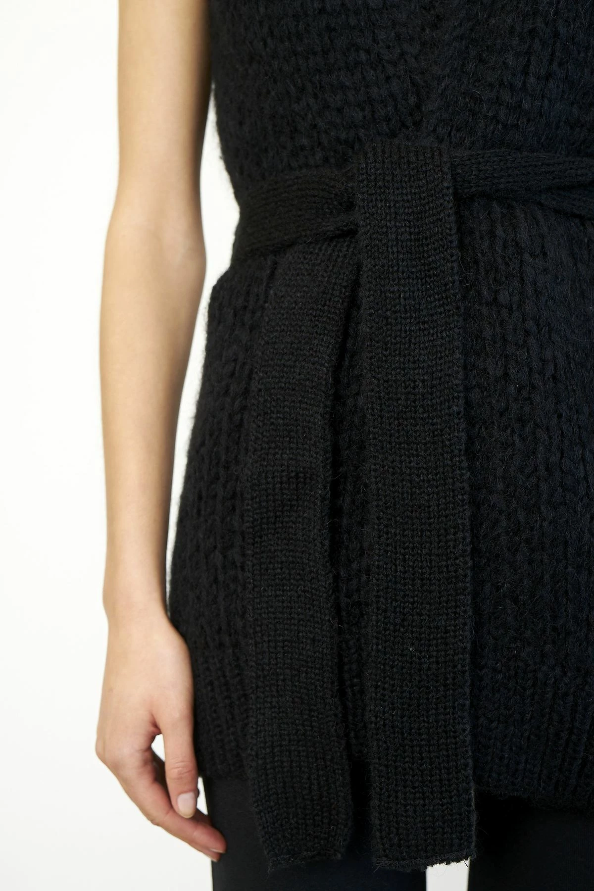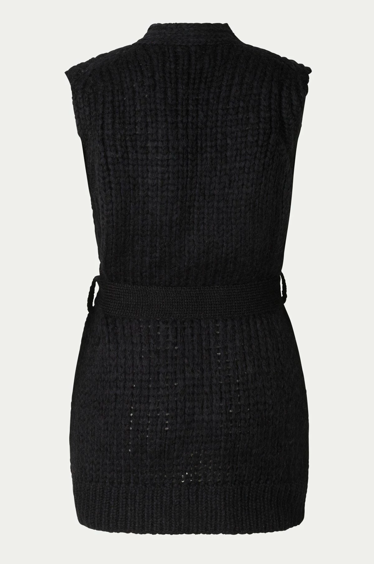 Lovely long knitted waistcoat in a soft mohair, acrylic and polyamide mix. The waistcoat comes with a belt. this style looks lovely styled over a dress or more layered looks.