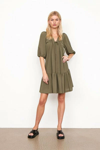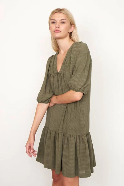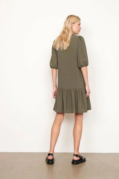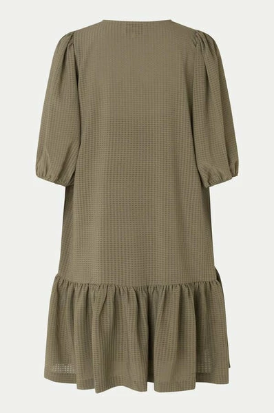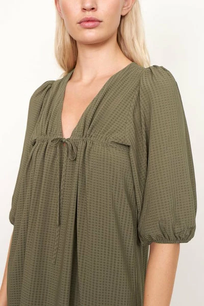 This loose fitted dress has deep V-neckline, drawstring detail at front and wide frill panel at bottom. It has gatherings at shoulder for the voluminous sleeve and elasticated cuff. This style comes with a slip dress. Loose fit Deep V-neck Drawstring detail Slip dress 100% Polyester Viscose