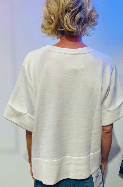 Dieses weiche, kastige Shirt hat einen breiteren Umschlag am Ärmel und kleine, seitliche Schlitze. Material: 56% Nylon 44% Baumwolle Pflegehinweis: Feinwäsche