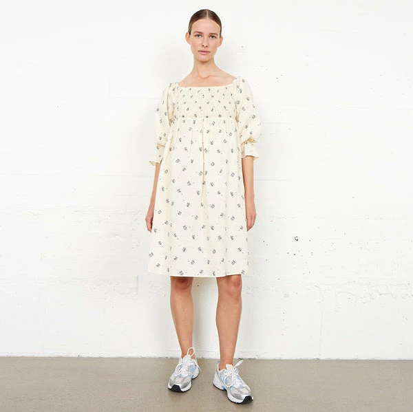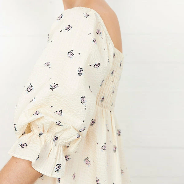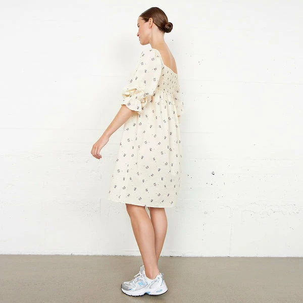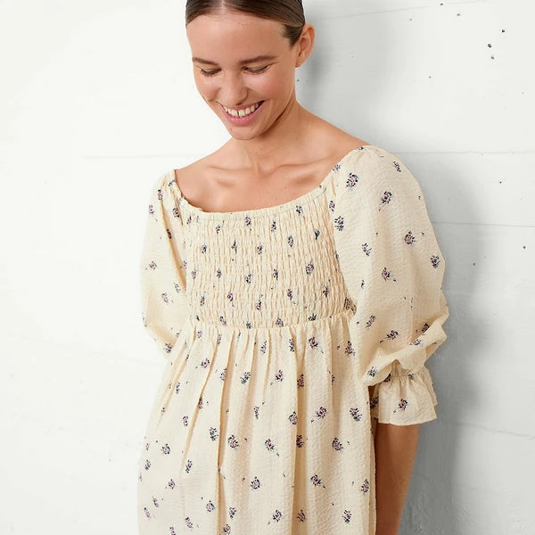 A comfortable style for Summer from women’s fashion brand Second Female. Crafted from a lightweight, 100% cotton with a structured texture and all over floral print, this pretty dress features a shirred section at the top, an elasticated hem at the shoulders with puffed three quarter length sleeves, ruffle edge details, tight fitting bust and loose fitting skirt. The perfect throw-on-and-go style for everyday wear. Toka Brazilian Sand Dress from Second Female. Made from 100% Cotton. Wash at 30°C (Gentle Process). Do not bleach. Do not tumble dry. Iron on low. Dryclean – Any Solvent Except Trichloroethylene. Wash inside out with similar colours. Season: Summer 2022.