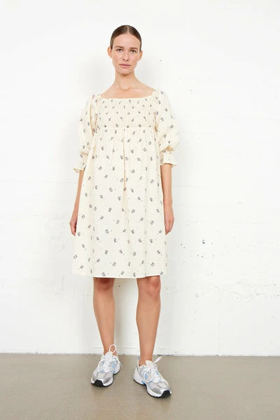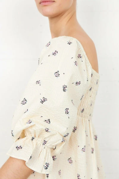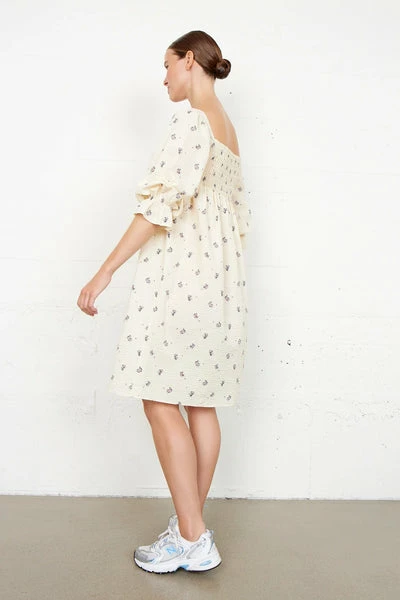 This gorgeous seersucker cotton dress from Second Female is a rich cream colour with a pretty floral print. The easy pull on style features a shirred bodice with a square neckline and an elbow length sleeve with an elasticated cuff. Cut to sit at the knee this dress is a perfect every day wear and has the much loved in seam pockets. Pair with you favourite trainers and denim jacket for an easy every day look, or slip on some sliders and add a basket bag for a lovely holiday look. Pull on Shirred bodice Elbow length balloon sleeves Elasticated cuff with frill In seam pockets Straight hem 90cm shoulder to hem (S) Chest 40 cm (S) 100% Cotton Machine washable at 30 degrees 55980