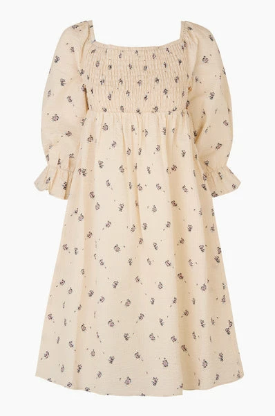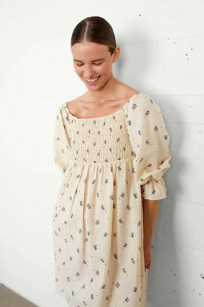 Second Female dress with shirred dress. Made in lightweight cotton with structured texture and floral print. Featuring a shirred section at the top and elasticated hem at the shoulders with puffed three-quarter length sleeves with ruffled ends. Fits tightly across the bust before flaring out into a loose skirt. Lightweight printed cotton Shirred section at top Tight bust, loose skirt