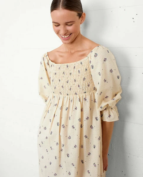 Second Female Toka Sand Dress, a cream coloured sundress with a square neckline and voluminous 3/4 sleeves. Smocked across the bodice this textured cotton midi dress has frilly cuffs and an a-line skirt. 100% Cotton Machine wash at 30 XS – UK8, S – UK10, M – UK12, L – UK14 Size down if between sizes as Second Female sizes generously