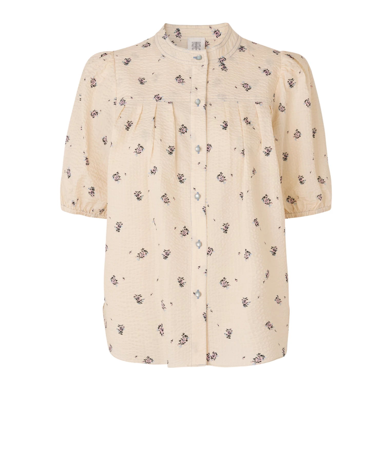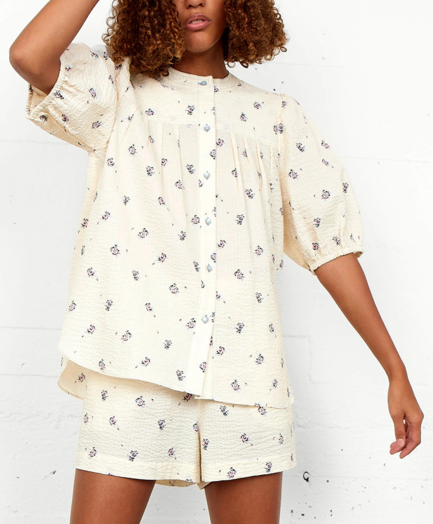Second Female blouse with contrast buttons. Made in lightweight cotton with structured texture and floral print. Featuring round neck with coloured buttons, puffed sleeves with elasticated ends and twin stitching at neck and across chest. Pleats from bust seam to create fuller effect. Loose feminine fit that flares out slightly. Lightweight printed cotton Coloured buttons Loose, feminine fit