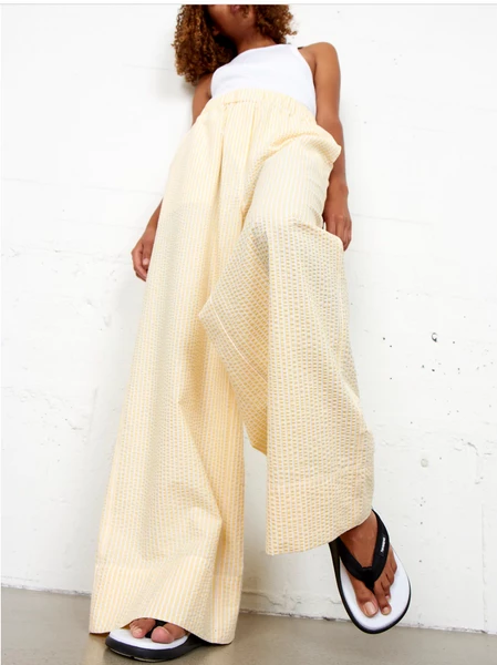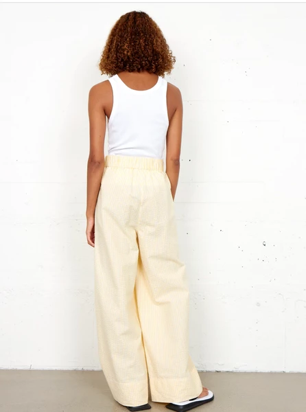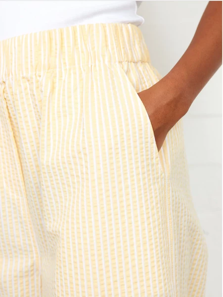 Trousers by SECOND FEMALE Cairo Trousers Second Female trousers with wide legs. Made in lightweight organic cotton with seersucker structure and all-over diagonal stripe. Featuring an elasticated waist and two slant pockets at the front. Fitted waist and wide, straight leg. Sustainable choice Seersucker structure Wide legs More info