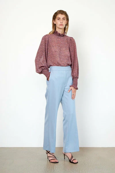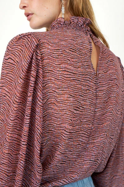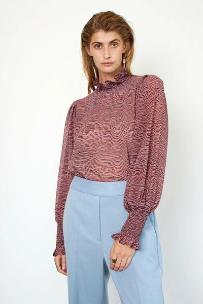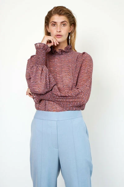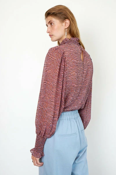 This printed blouse is made in a luxurious, 100% recycled polyester quality. The blouse has classic collar stand with frill detail and deep V-neckline with button closure. It has voluminous raglan sleeves with elasticated cuffs. The blouse has loose fit. 100% recycled polyester Raglan sleeve Loose fit Part of our Sustainable Choice