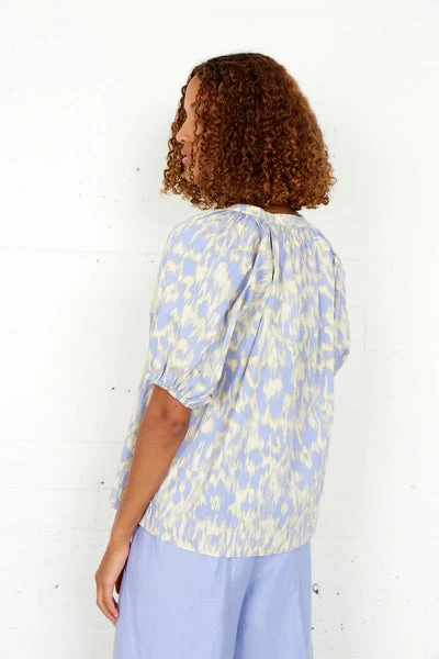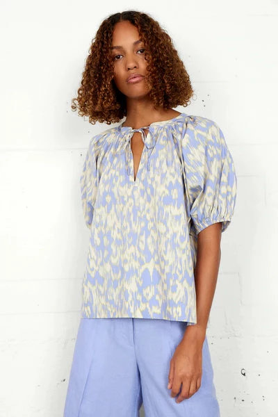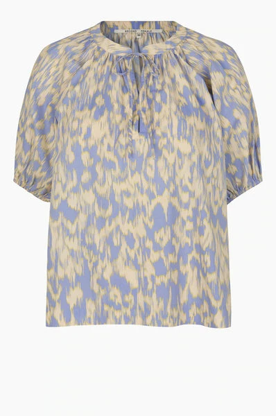 Diese Bluse mit abstraktem Muster ist aus einer leichten und glatten Bio-Baumwolle hergestellt. Sie hat einen Rundhalsausschnitt mit Bindeband, Raglanärmel mit elastischen Bündchen, die einen voluminösen Effekt erzeugen sowie eine lockere Passform. Material: 100% Bio-Baumwolle Pflegehinweis: Feinwäsche