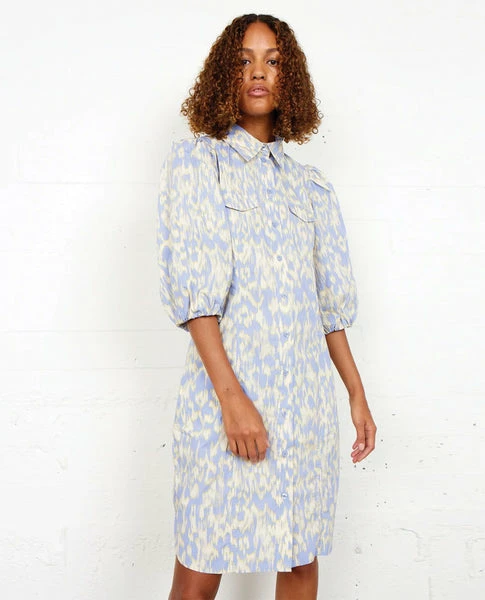 Second Female Viggo Shirt Dress, a crisp cotton shirt dress with elbow length puffed sleeves and a pointed collar. Fastening down the front with a row of buttons this knee length shirt dress has chest pockets and is an abstract combination of pink and bluish lilac. 100% Organic Cotton Machine wash at 30 XS – UK8, S – UK10, M – UK12, L – UK14 Size down if between sizes as Second Female sizes generously