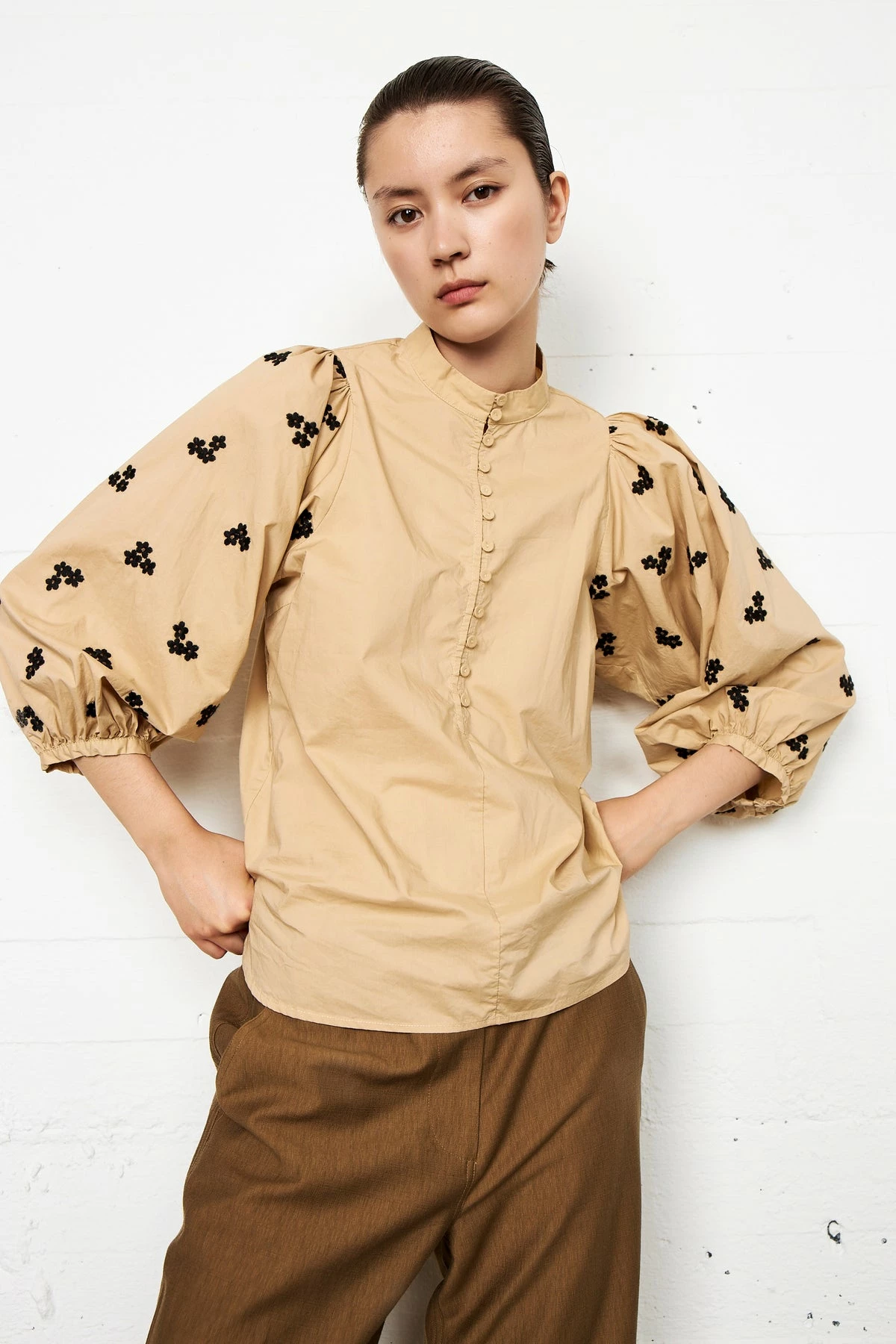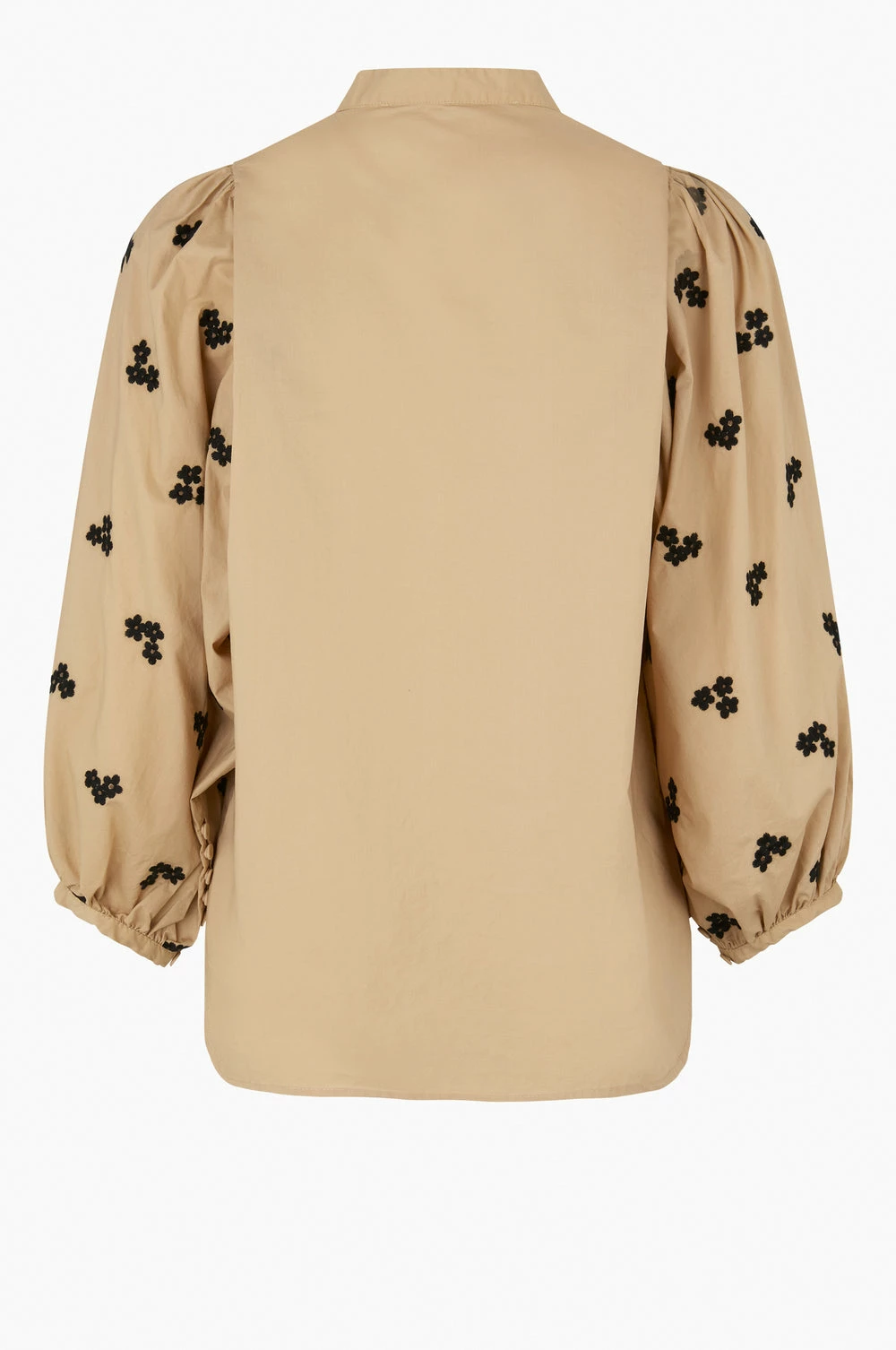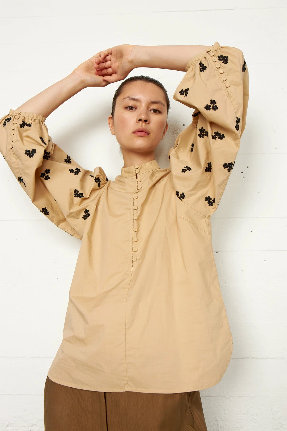 Wisteria Blouse with a loose fit. The blouse has very big, beautiful sleeves with small cuffs with buttons on the backside. The blouse has a high neck with nice button opening half way down the body, which when opened gives a more casual look. The blouse has a solid-colored body and printed sleeves.
