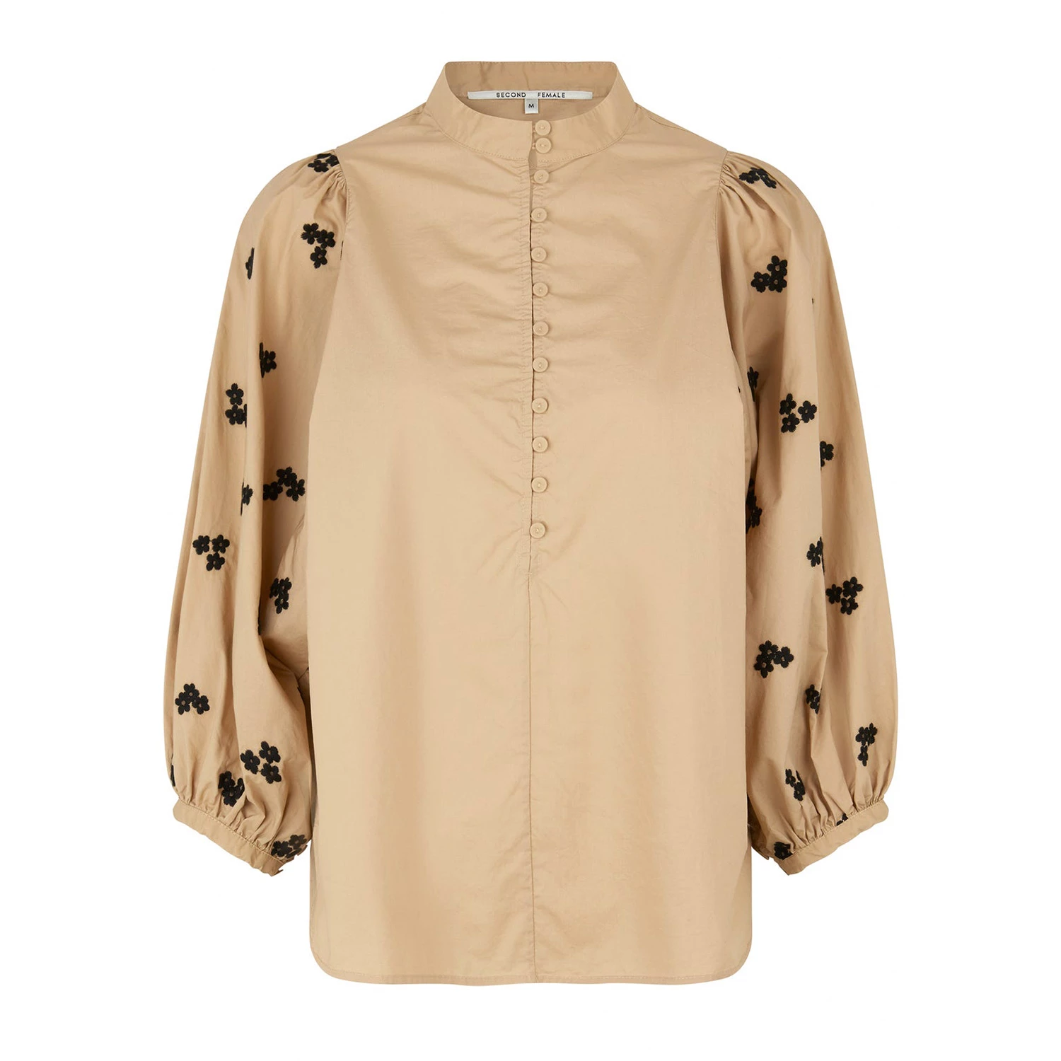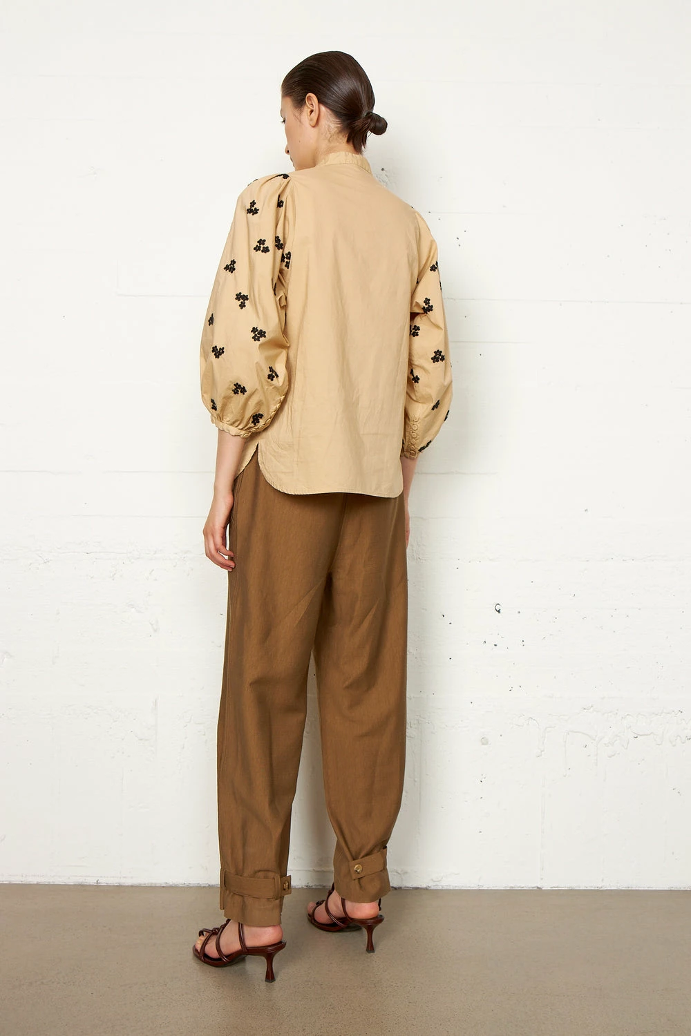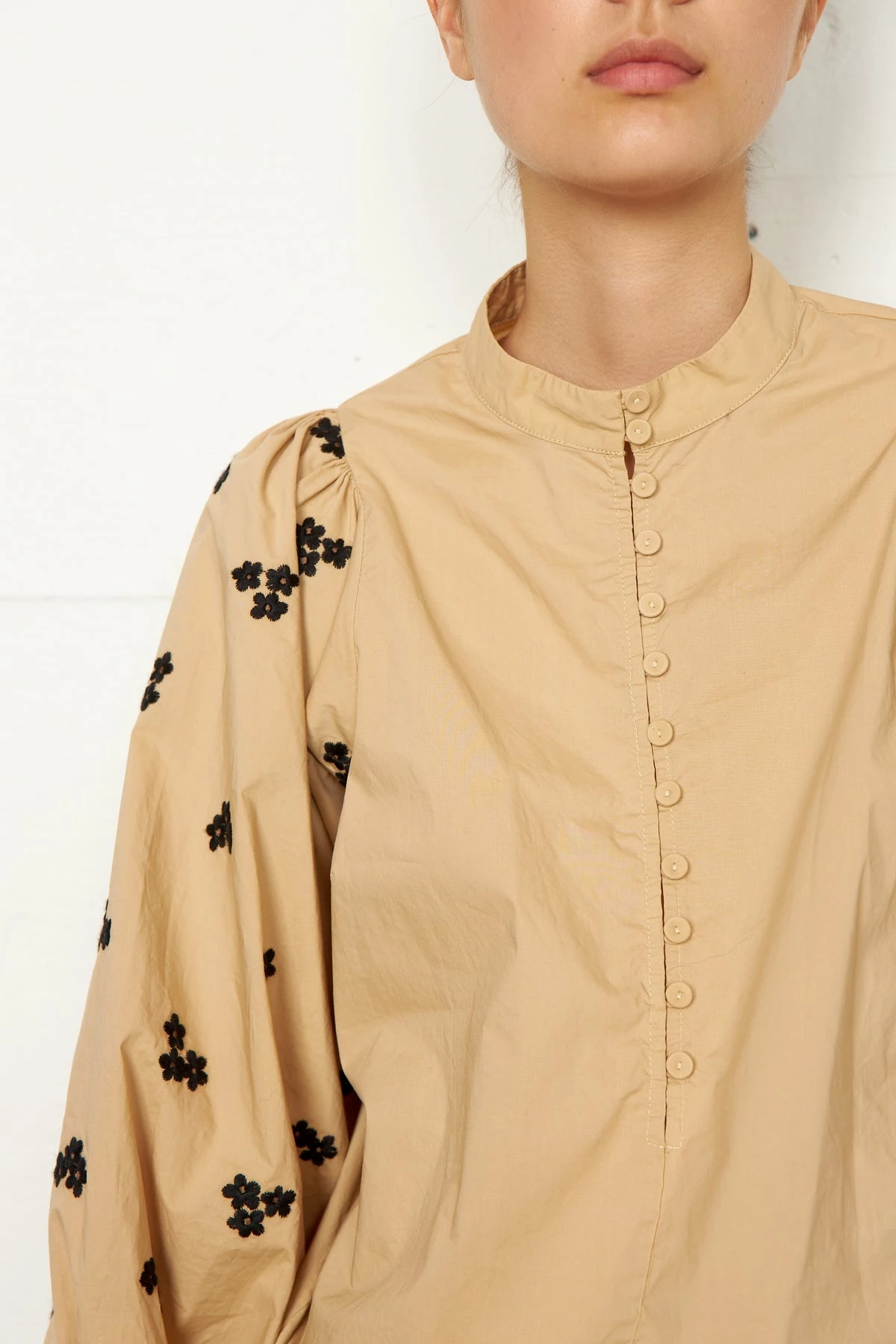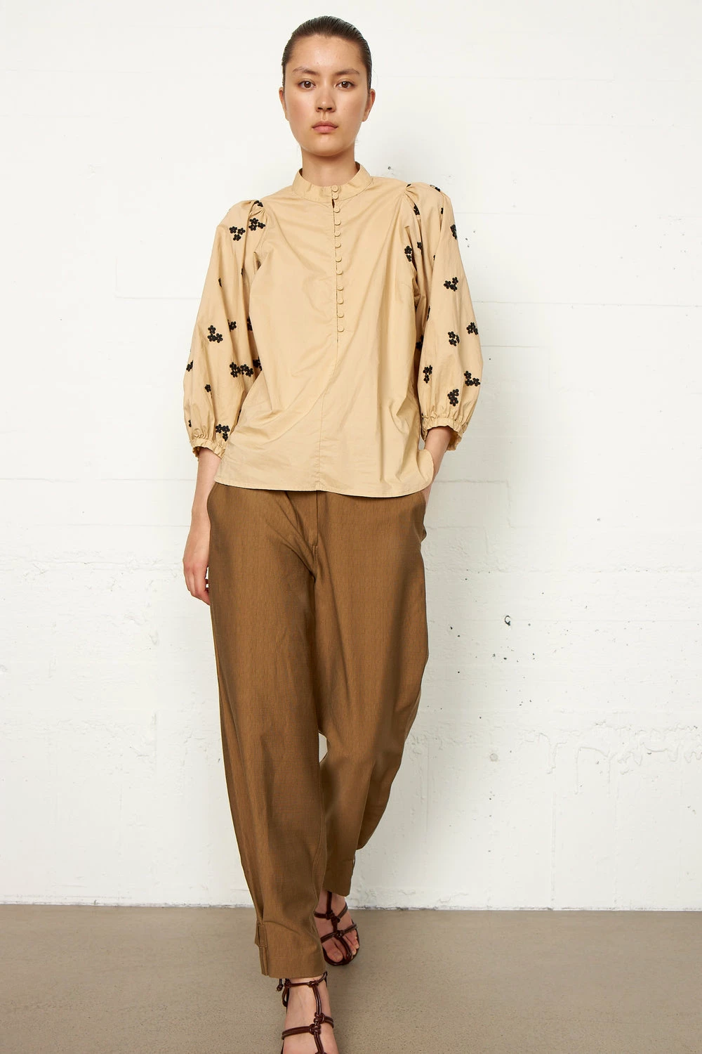 Wisteria Blouse with a loose fit. The blouse has very big, beautiful sleeves with small cuffs with buttons on the backside. The blouse has a high neck with nice button opening half way down the body, which when opened gives a more casual look. The blouse has a solid-colored body and printed sleeves.