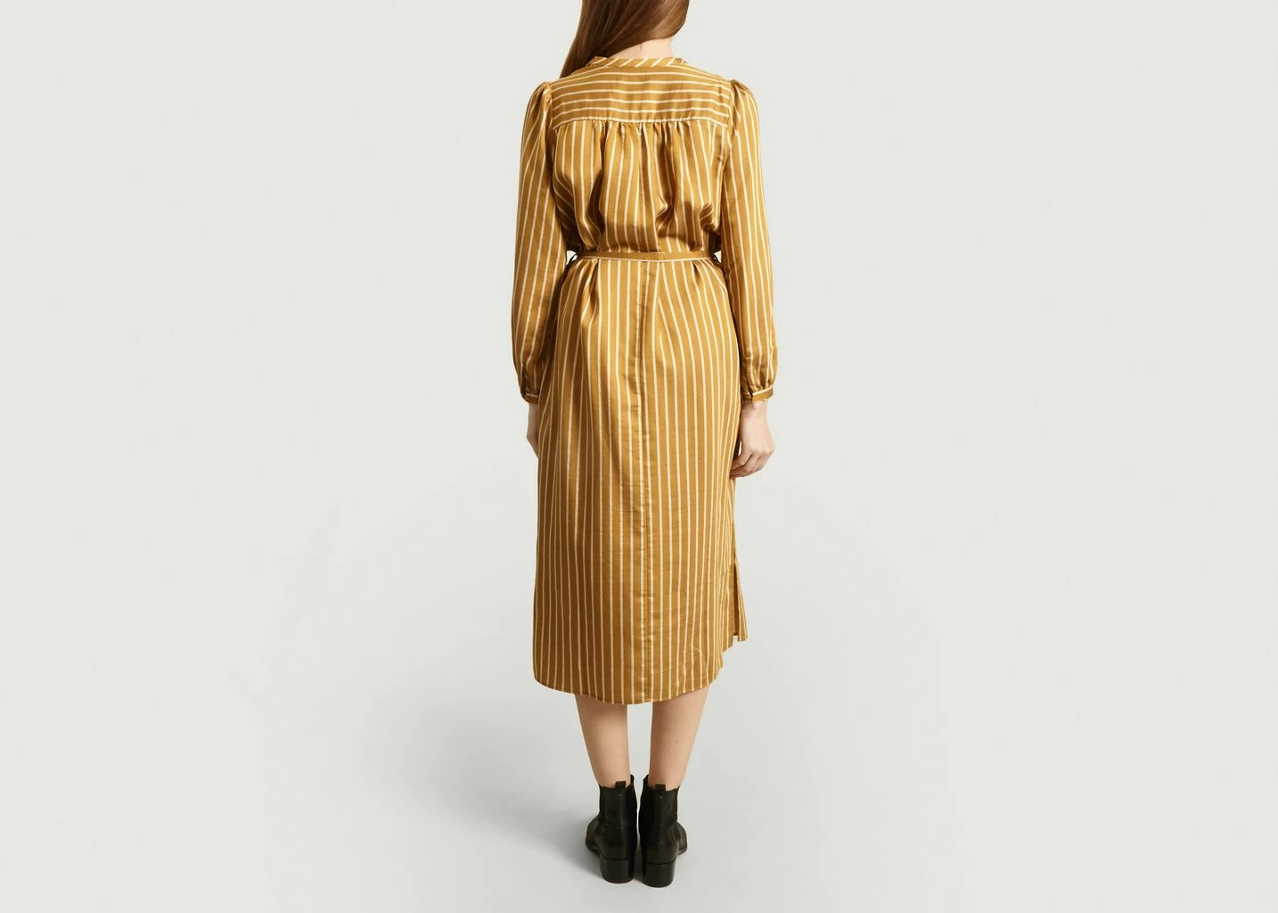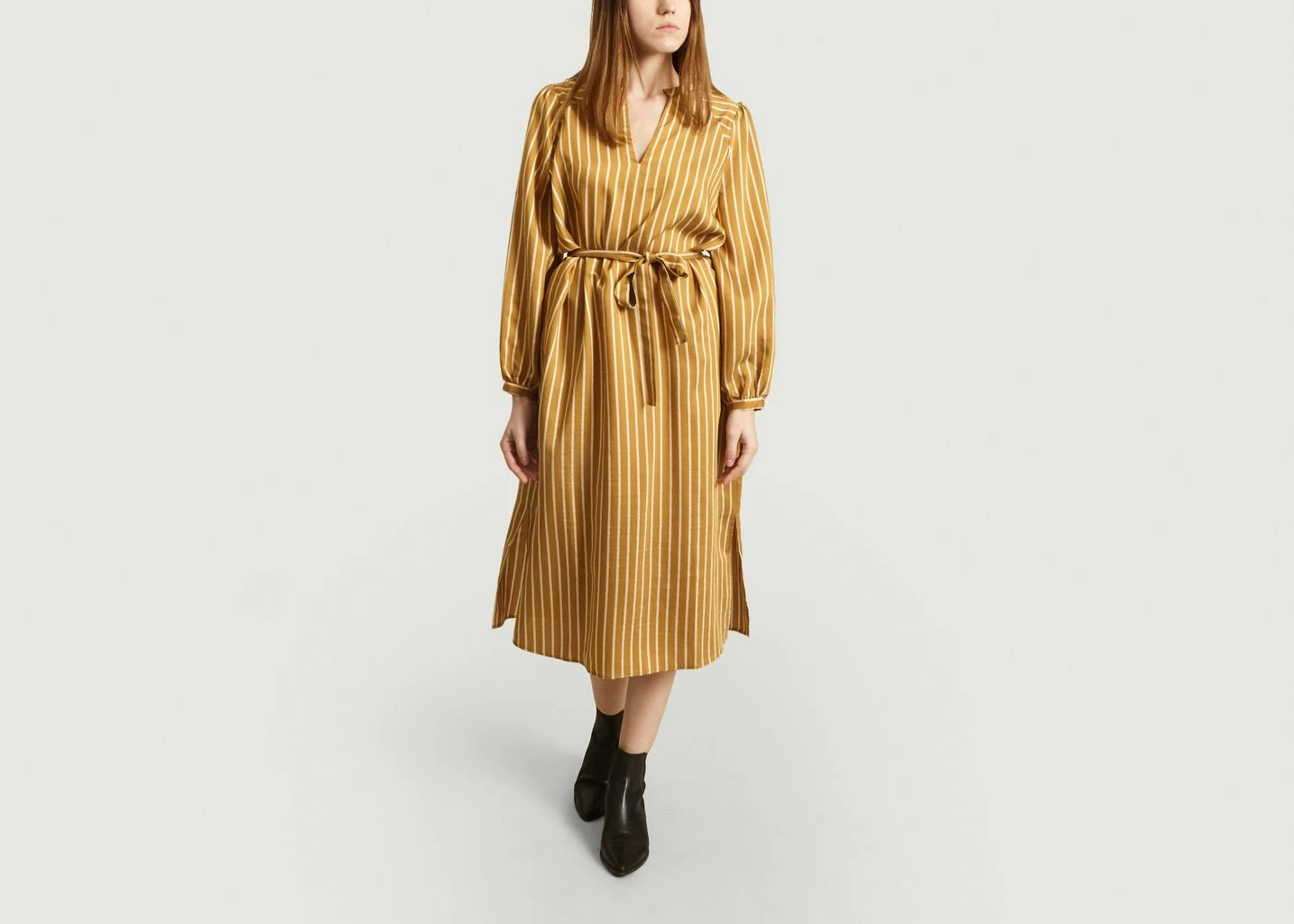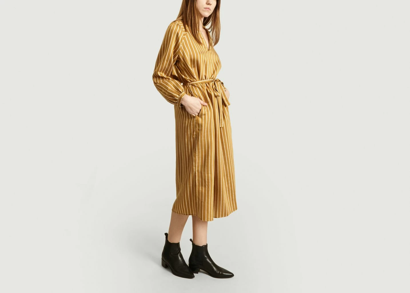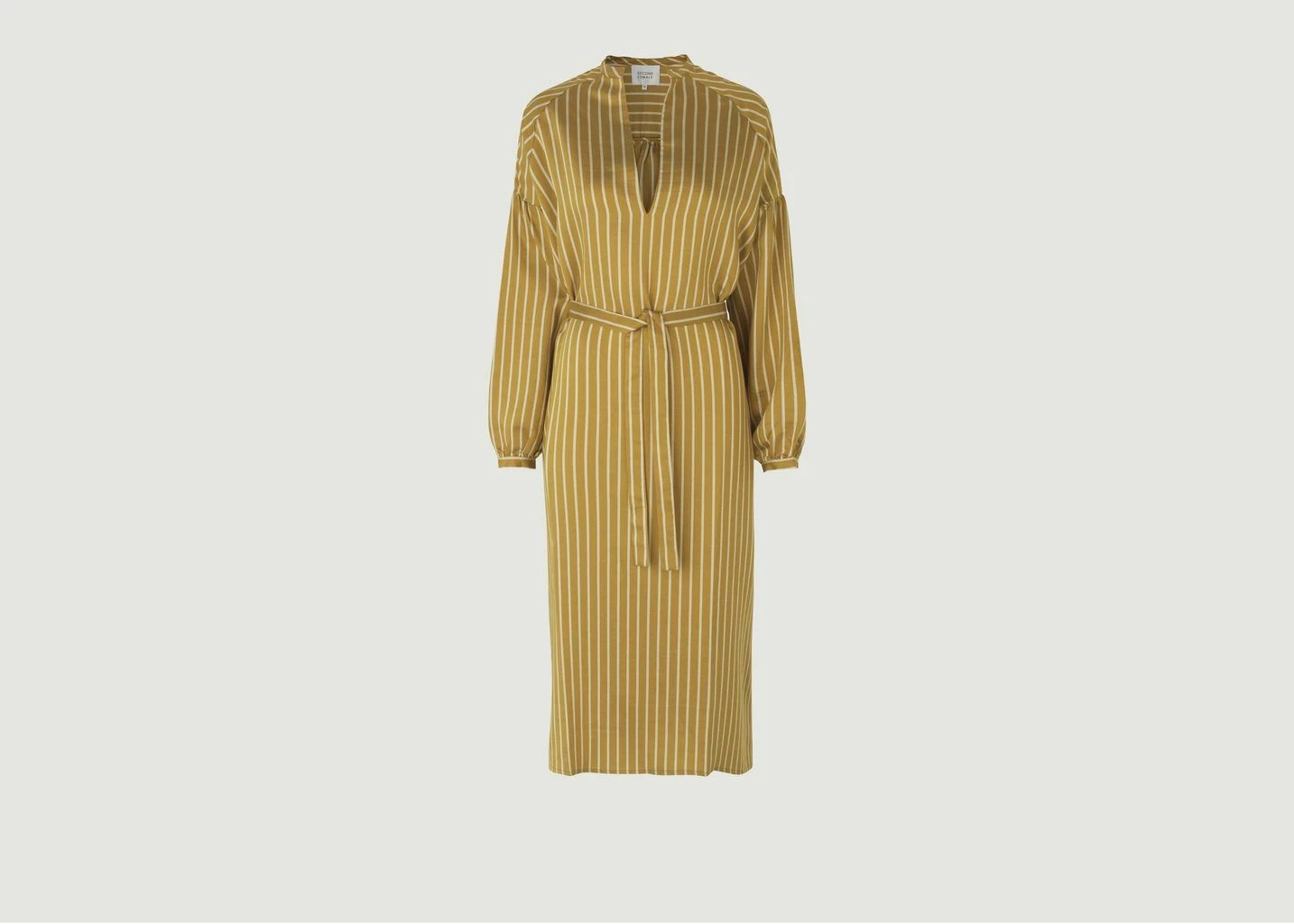 Shirt dress Diana made of tencel and polyester in a yellow color with striped print. Casual cut, it features a deep V-neck, long balloon sleeves with tightened cuffs, drooping shoulders, tie detail, low armholes, long raglan sleeves, a tie belt at the waist, an all-over striped print and tone-on-tone stitching.