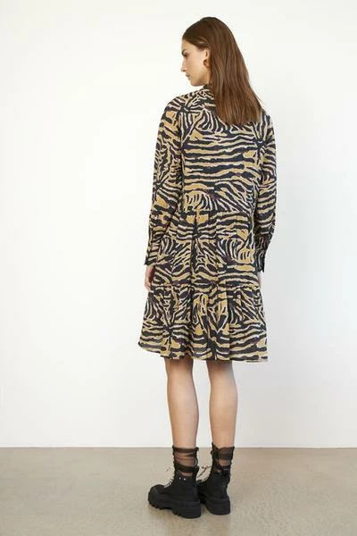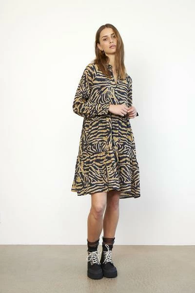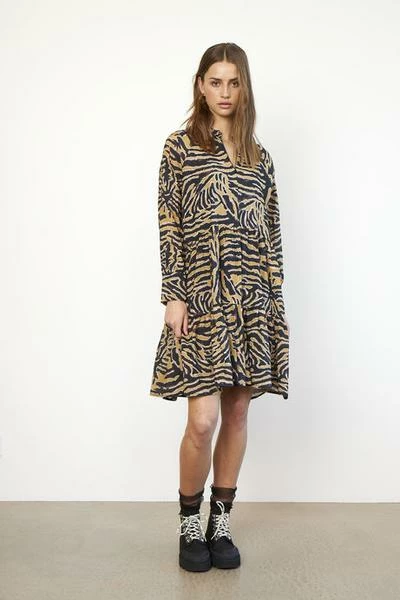 Zebraly Dress By Second Female Printed dress in a viscose and polyamide mix. The dress is knee length and with long sleeves. The shape of this dress is flaired and the body has gathered panels across the body. The neckline has a little stand with frills and the hidden button stand finishes off at the waist seam. Printed dress Knee length and with long sleeves Gathered panels across the body . 100% Sustainable More info or can’t find what your are looking for? Contact us Can’t decide? Ask your friends!